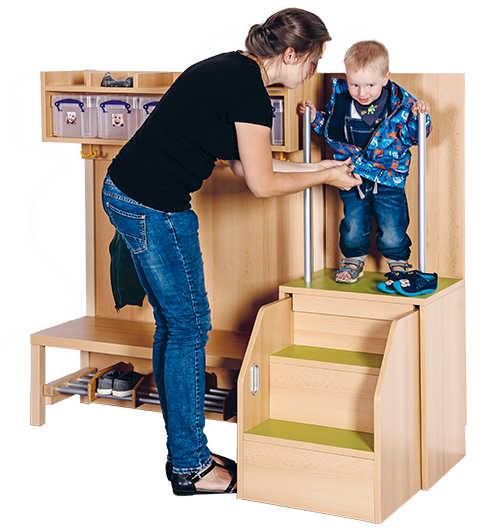 Die praktische Anziehhilfe lässt sich in Garderobenanlagen integrieren, kann aber auch einzeln montiert werden. Das Kind kann sich beidseitig an stabilen Haltestangen festhalten, während es beim Anziehen geholfen bekommt. Die Stufen der Aufstiegshilfe sind ausziehbar, damit steht die Anziehhilfe bei Nichtbenutzung platzsparend vor der Wand. Stufen und Podestebene sind mit wasser- und kratzfestem Linoleum belegt, sie sind damit widerstandsfähig und trotzdem leicht zu reinigen. Die Podesthöhe beträgt jeweils 60 cm. Das Korpusdekor und die Linoleumfarbe sind wählbar.