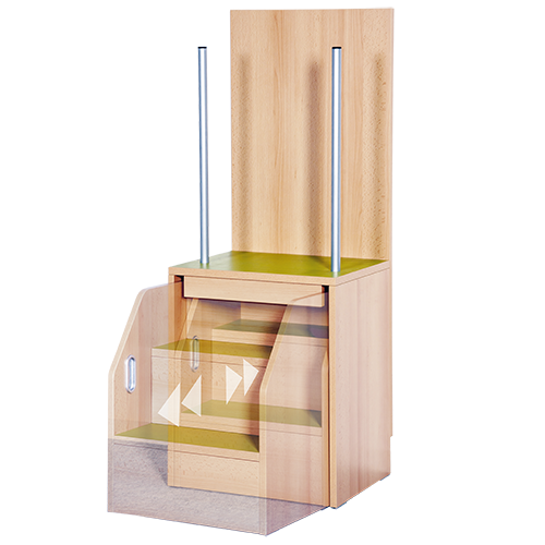 Die praktische Anziehhilfe aus feuerhemmendem B1-Material mit Buche-Dekor lässt sich in Garderobenanlagen integrieren, kann aber auch einzeln montiert werden. Das Kind kann sich beidseitig an stabilen Haltestangen festhalten, während es beim Anziehen geholfen bekommt. Die Stufen der Aufstiegshilfe sind ausziehbar, damit steht die Anziehhilfe bei Nichtbenutzung platzsparend vor der Wand. Stufen und Podestebene sind mit wasser- und kratzfestem Linoleum belegt, sie sind damit widerstandsfähig und trotzdem leicht zu reinigen. Die Podesthöhe beträgt jeweils 60 cm. Die Linoleumfarbe ist wählbar.