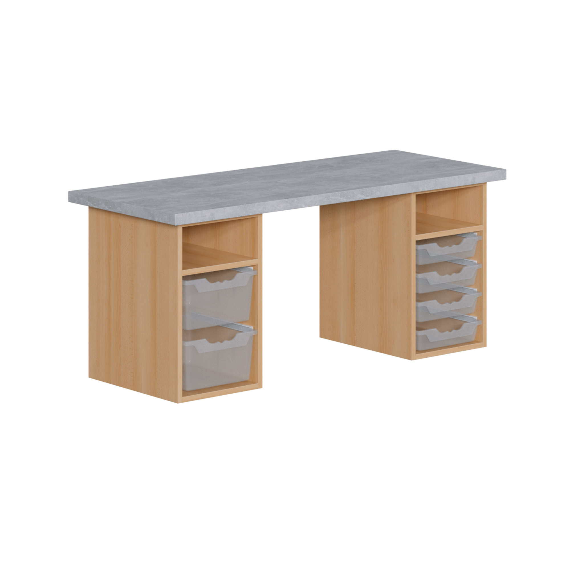 Je nach Größe des Bastelarbeitsplatzes befinden sich unter der Arbeitsplatte mit dem Dekor "Light Atelier" in verschiedener Anzahl Korpusse mit unterschiedlichen Ausstattungen zur Aufbewahrung von Material und Werkzeug - oder der Ablage der bearbeiteten Projekte. Eine Dekorwahl der Korpusse ist natürlich ebenso möglich wie die Farb-Auswahl der ErgoTray-Boxen, wenn diese zur gewünschten Ausstattung gehören.