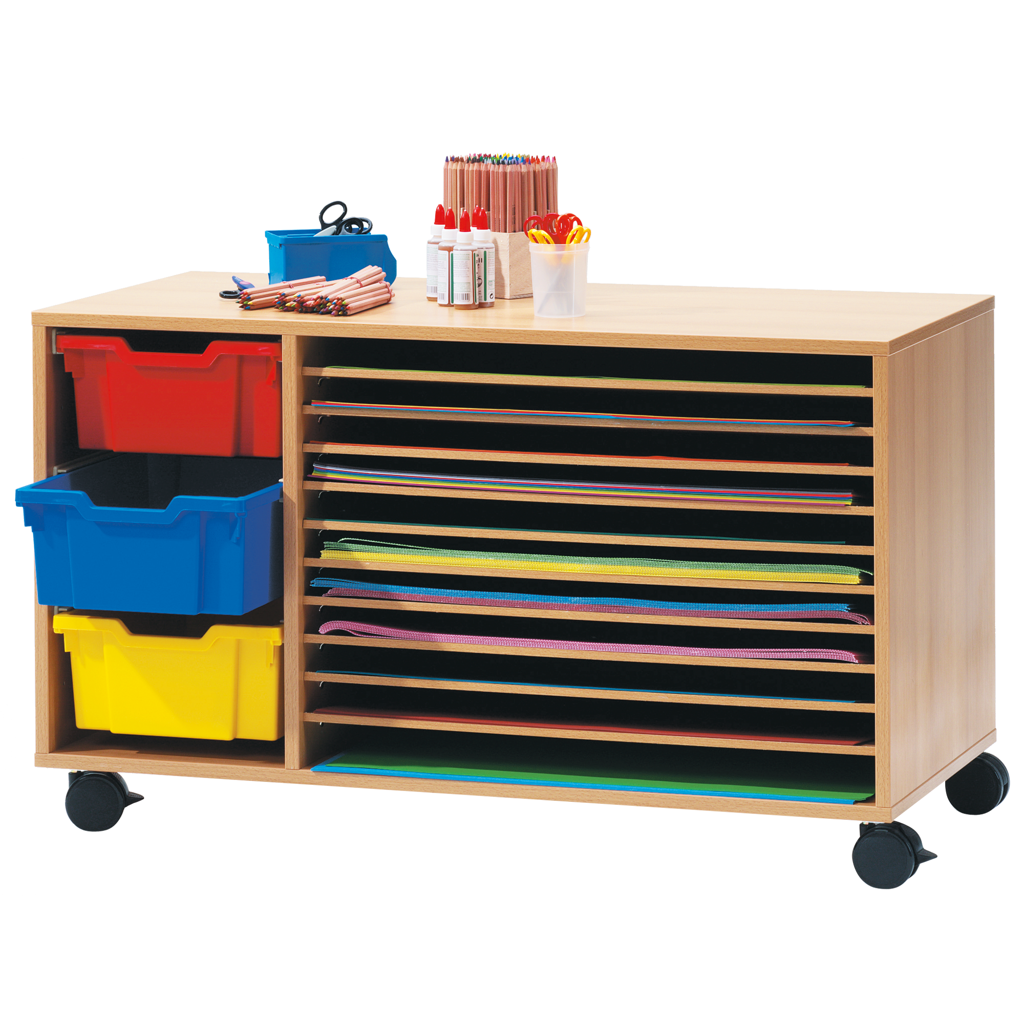 Der fahrbare Bastelwagen für Papier mit 3 hohen A4 Ergo Tray Boxen und 10 Fachböden ist für Papiermaße bis 50 cm x 70 cm geeignet. Stifte, Pinsel, Farben, oder anderes Zubehör lassen sich problemlos in den ErgoTray Boxen verstauen.