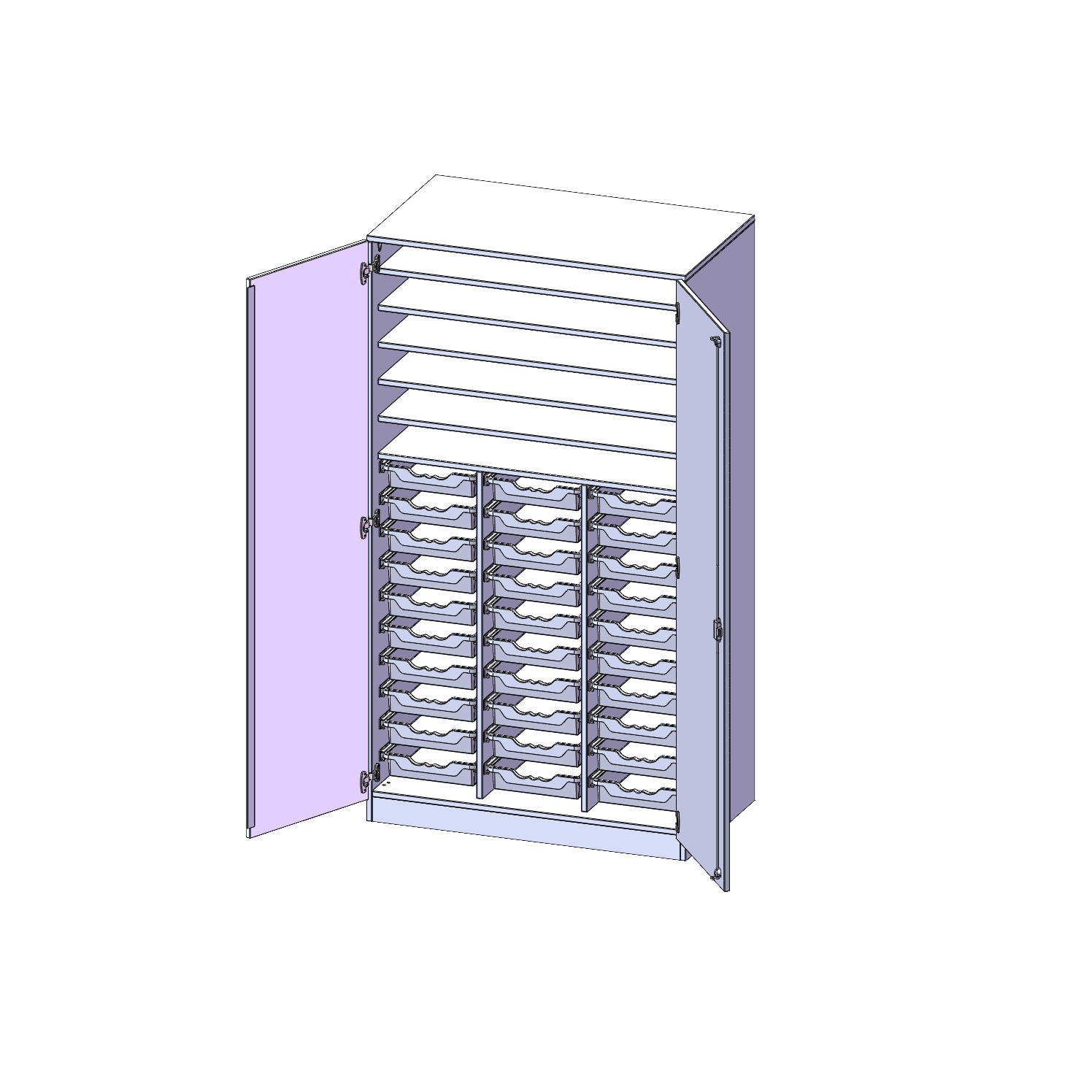 B/H: 104,5x190 cm, mit Sockel (81 mm), 2-türiger Schrank mit 30 flachen ErgoTray Boxen