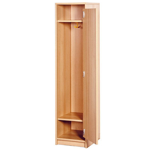 Garderobenschränke bieten dem Personal ausreichend Raum für Bekleidung und Privates. Die Grundmaße des Schrankes sind an die Garderoben angepasst, B/H/T: 36x158x40 cm. Zur besseren Belüftung des Innenraumes bildet die Tür oben und unten jeweils einen Lüftungsschlitz aus. Das Korpusdekor ist wählbar, ebenso die farbenfrohen Dekore der Türen. Die Innenausstattung des Schranks besteht aus Hut- und Schuhboden sowie einem mittigen Kleiderfach mit Dreifach-Garderobenhaken. Die Tür kann auf Wunsch durch ein verschieden schließendes Schloss gesichert werden.