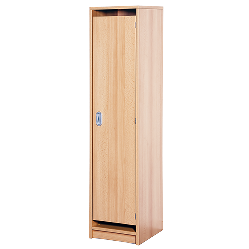 Die Grundmaße des Schrankes sind an die Garderoben angepasst B/H/T: 36x158x40 cm. Zur besseren Belüftung des Innenraumes bildet die Tür oben und unten jeweils einen Lüftungsschlitz aus. Das Korpusdekor ist wählbar, ebenso die farbenfrohen Dekore der Türen. Die Innenausstattung des Schranks besteht aus höhenverstellbaren Einlegeböden, die 7 Fächer mit ca. 19,5 cm lichter Höhe bilden.