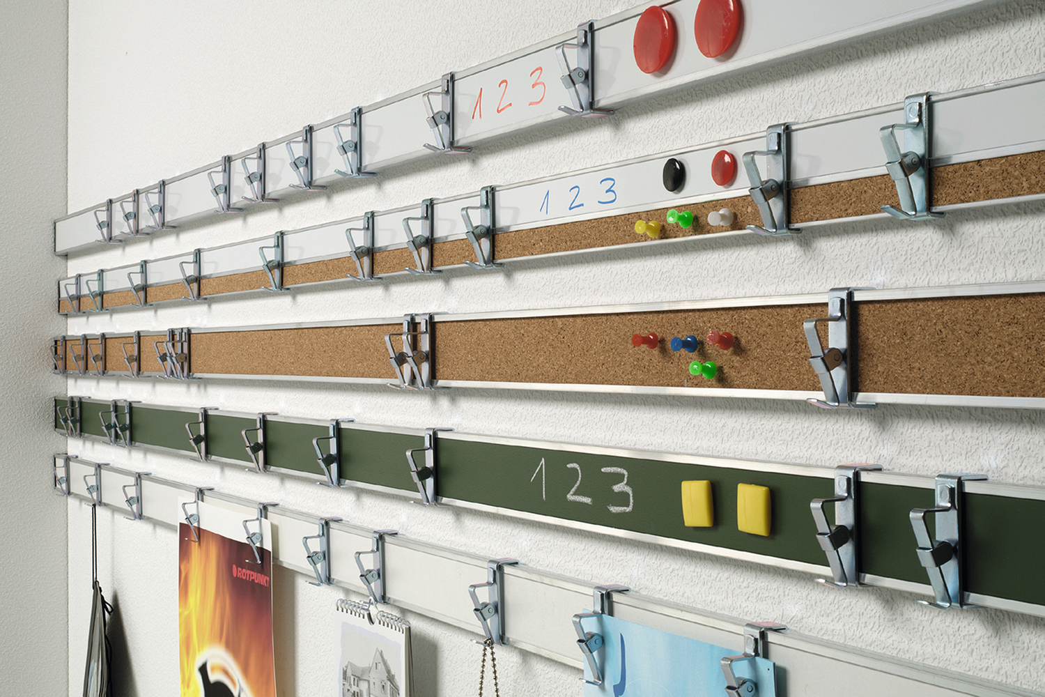 Bilderklemmleiste mit weißer Stahloberfläche, zum zusätzlichen Anheften von Informationen mittels Kraftmagneten und Beschriftungsmöglichkeit mit trocken abwischbaren Whiteboardmarkern. Verfügbare Beschriftungsfläche 45 mm.