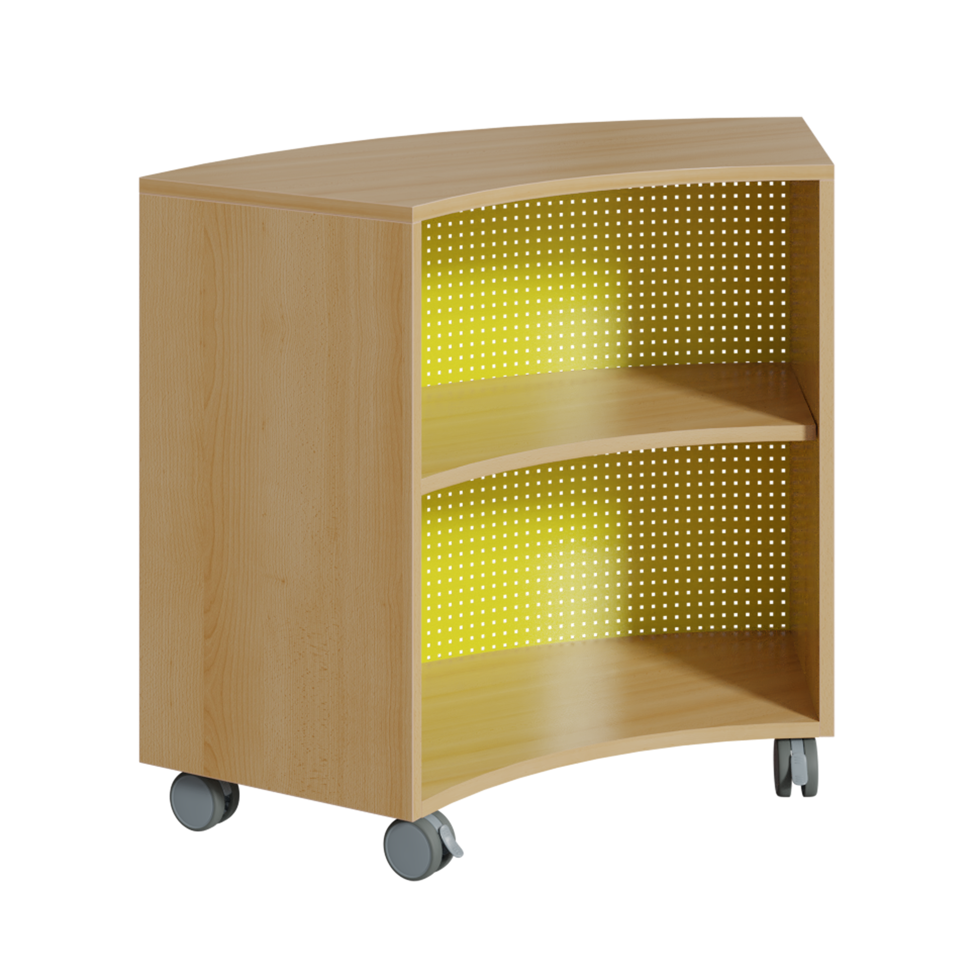 "Ein elegant gerundetes Sechstelkreis-Regal, was dazu noch fahrbar auf 5 Rollen sicher fährt, ist eine sehr schöne Ergänzung für die Einrichtung der Gruppenräume!" In Kombination mit anderen Regalen dieser Bauform kann ein interessanter Lindwurm gestaltet oder der Gruppenraum schnell und einfach für verschiedene Nutzungen getrennt werden. Varianten entstehen ganz problemlos durch Regale in unterschiedlichen Höhen oder mit verschiedenen Rückwandauführungen, die in Material und Farbe variieren - oder einfach auch weggelassen werden können! Natürlich läßt sich ein solches Regal auch schnell in andere Gruppenräume fahren - aber bitte nur ausleihen ;-))!