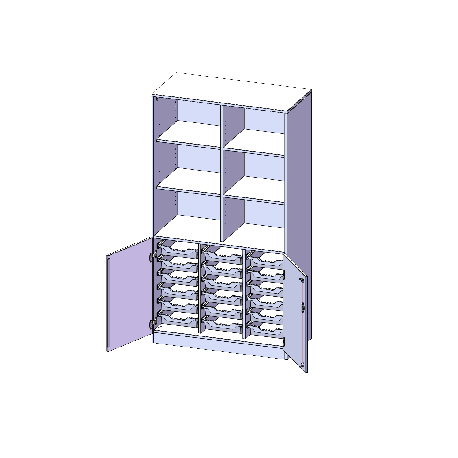 B/H/T: 104,5x190x50 cm, unten 2 OH Türen und 18 flache ErgoTray Boxen, oben 3 OH Regal, Sockel, mit Mittelwand