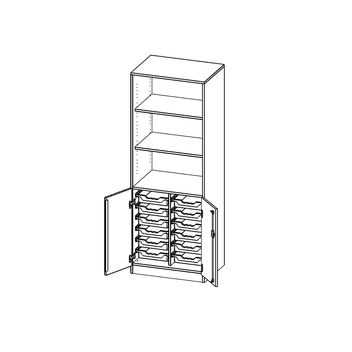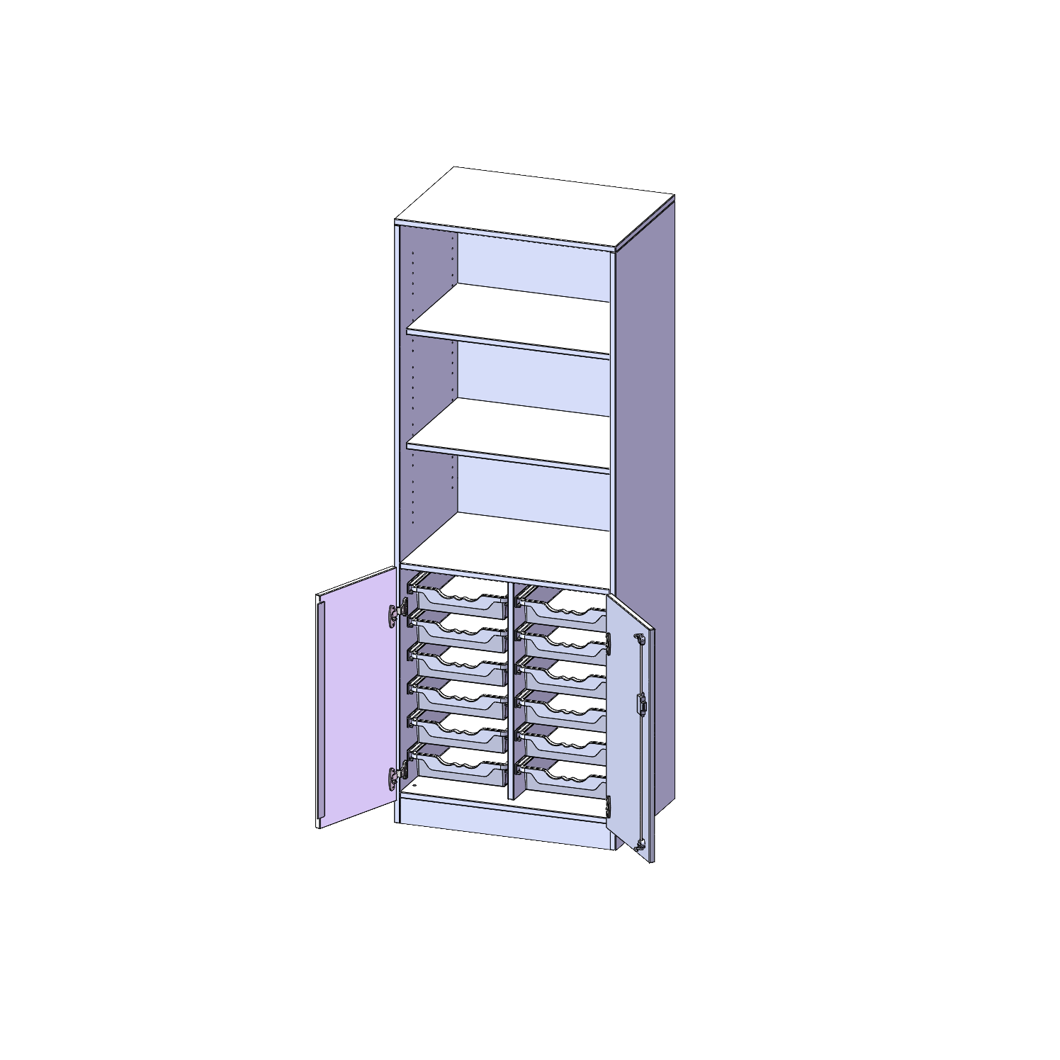 B/H/T: 70,3x190x50 cm, 2 OH unten mit Türen und 12 flachen ErgoTray Boxen, oben 3 OH Regal, mit Sockel (81 mm)