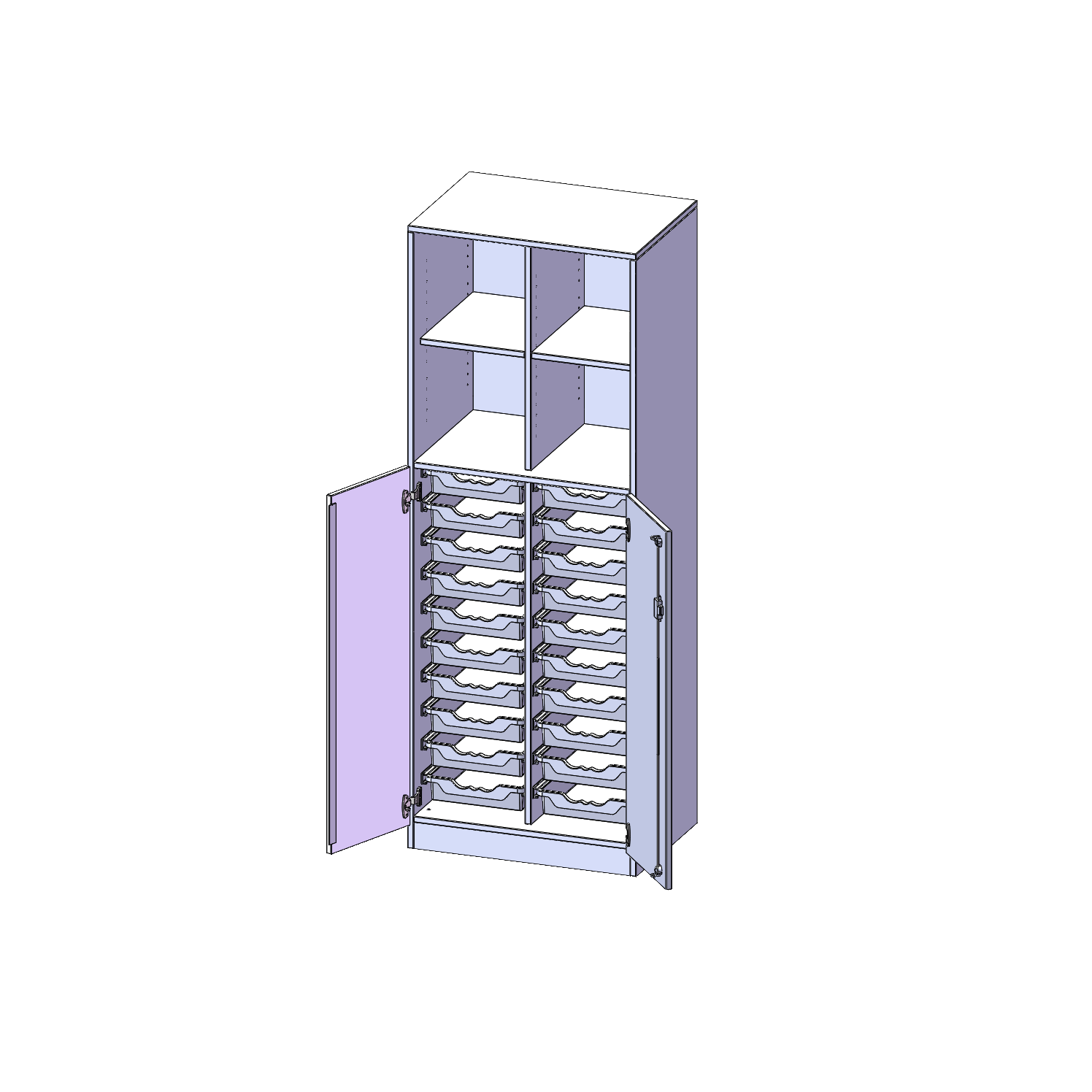 B/H/T: 70,3x190x50 cm, unten 3 OH Türen und 20 flache ErgoTray Boxen, oben 2 OH Regal, Sockel, mit Mittelwand