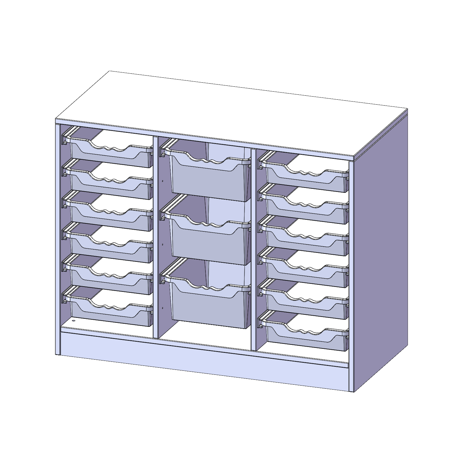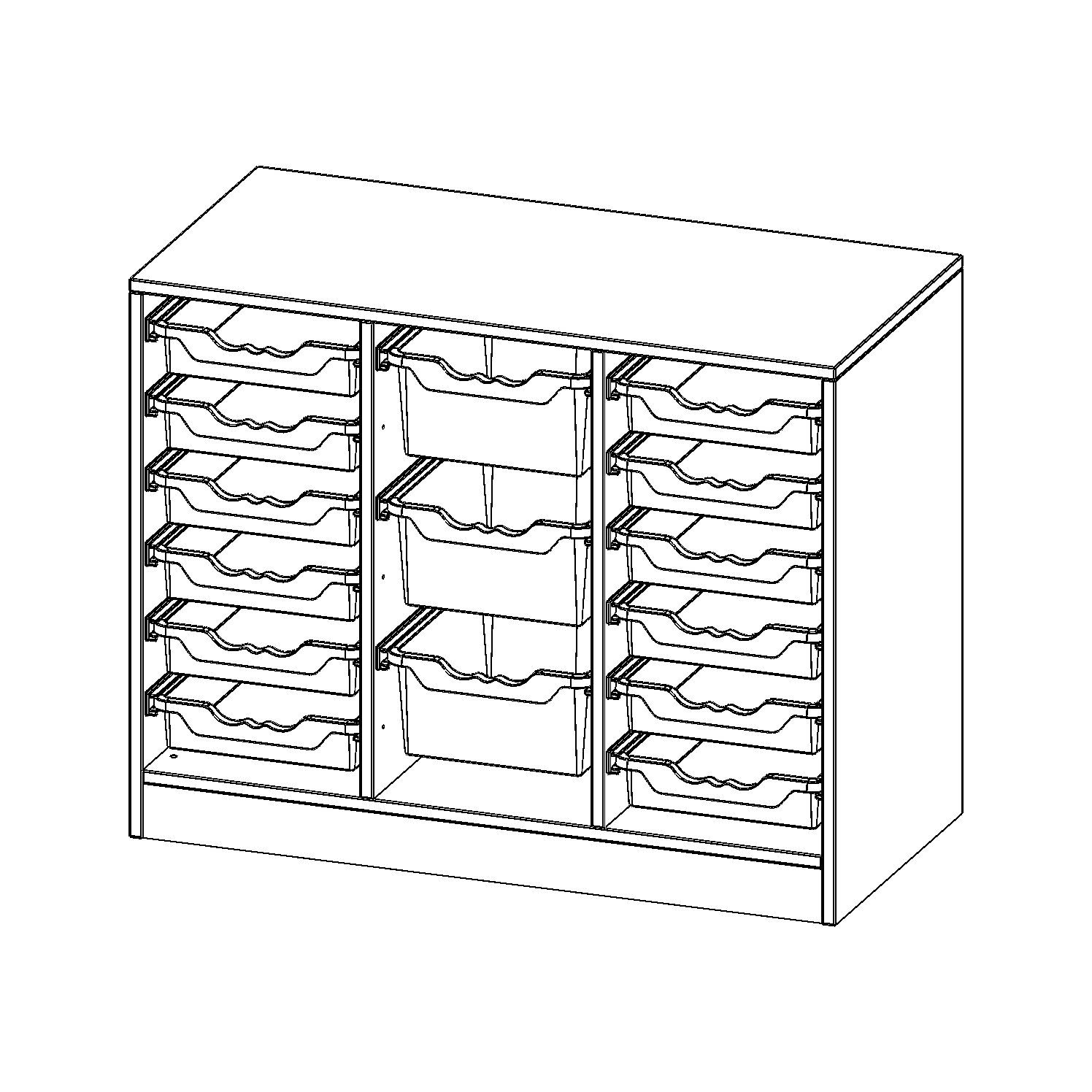 B/H/T: 104,5x82x50 cm, mit Sockel (81 mm), rechts und links je 6 flache, in der Mitte 3 hohe ErgoTray Boxen