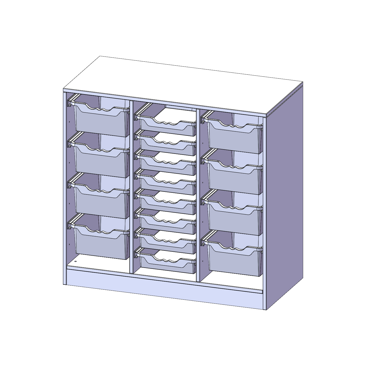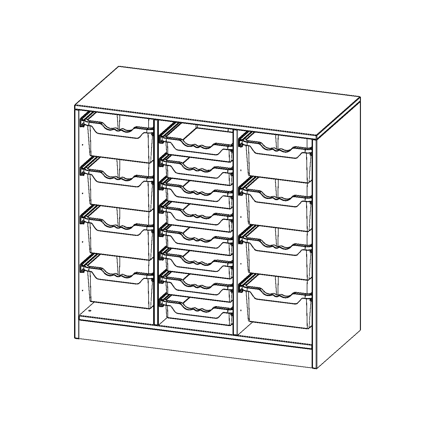 B/H/T: 104,5x100x50 cm, mit Sockel (81 mm), rechts und links je 4 hohe, in der Mitte 8 flache ErgoTray Boxen