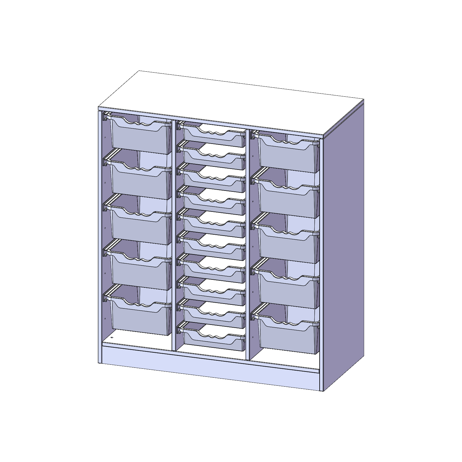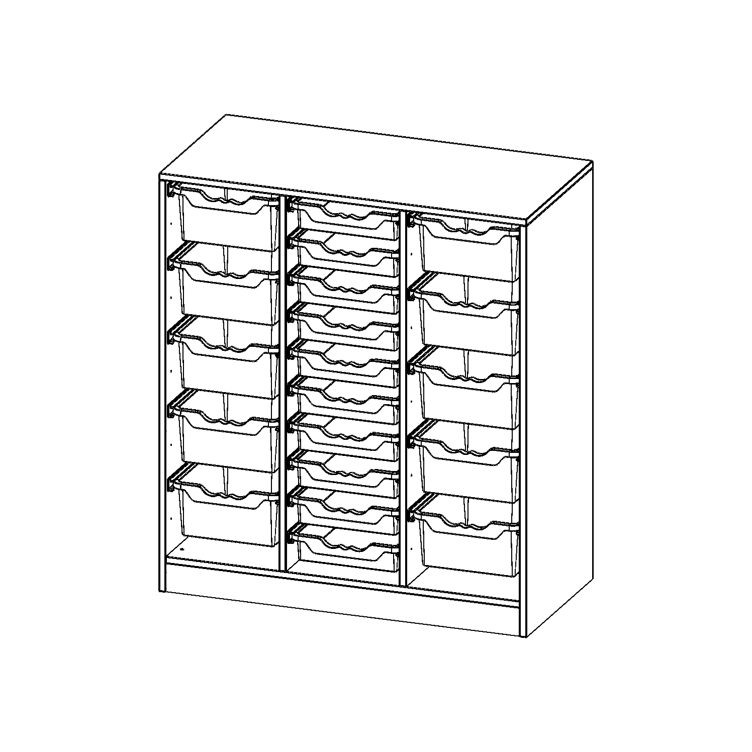B/H/T: 104,5x118x50 cm, mit Sockel (81 mm), rechts und links je 5 hohe, in der Mitte 10 flache ErgoTray Boxen