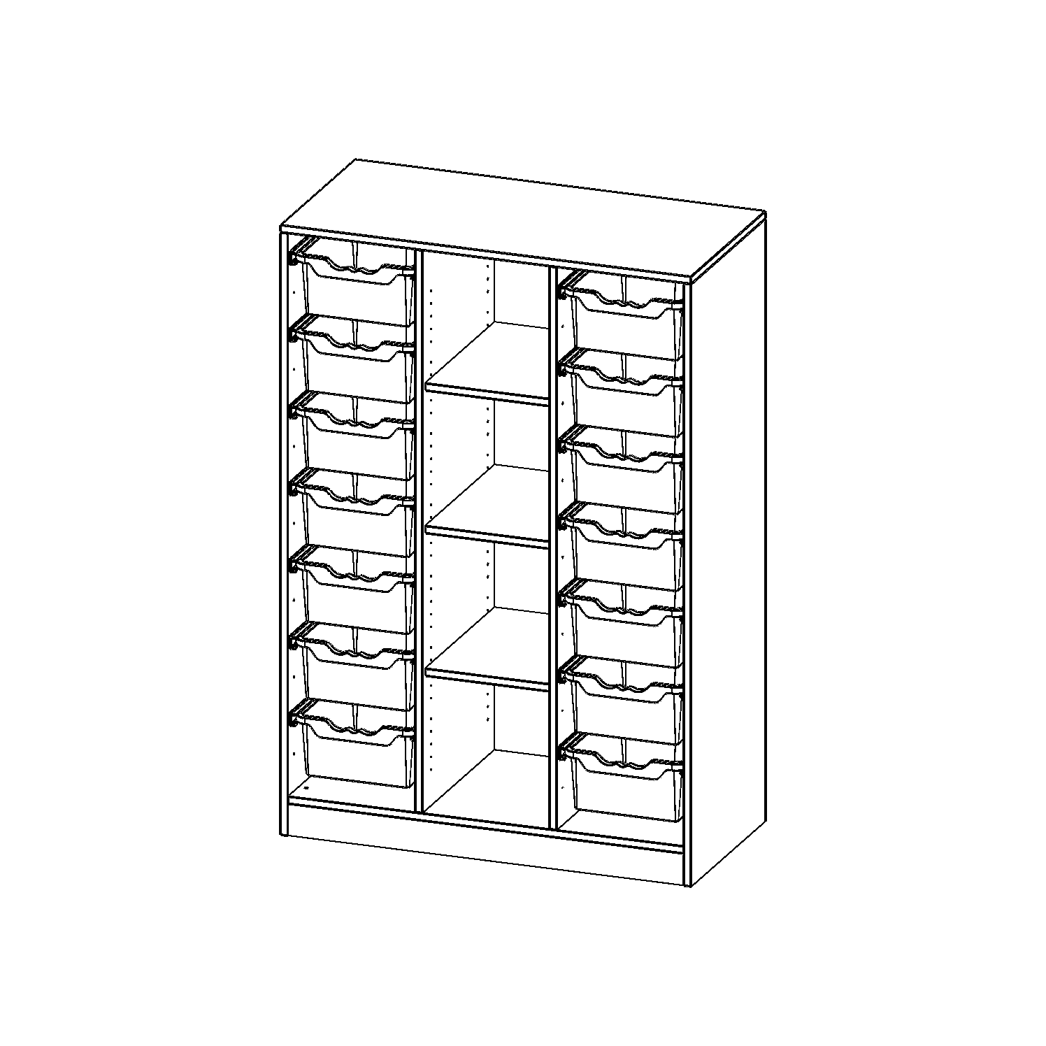 B/H/T: 104,5x154x50 cm, mit Sockel (81 mm), rechts und links je 7 hohe ErgoTray Boxen, 4 Fächer in der Mitte