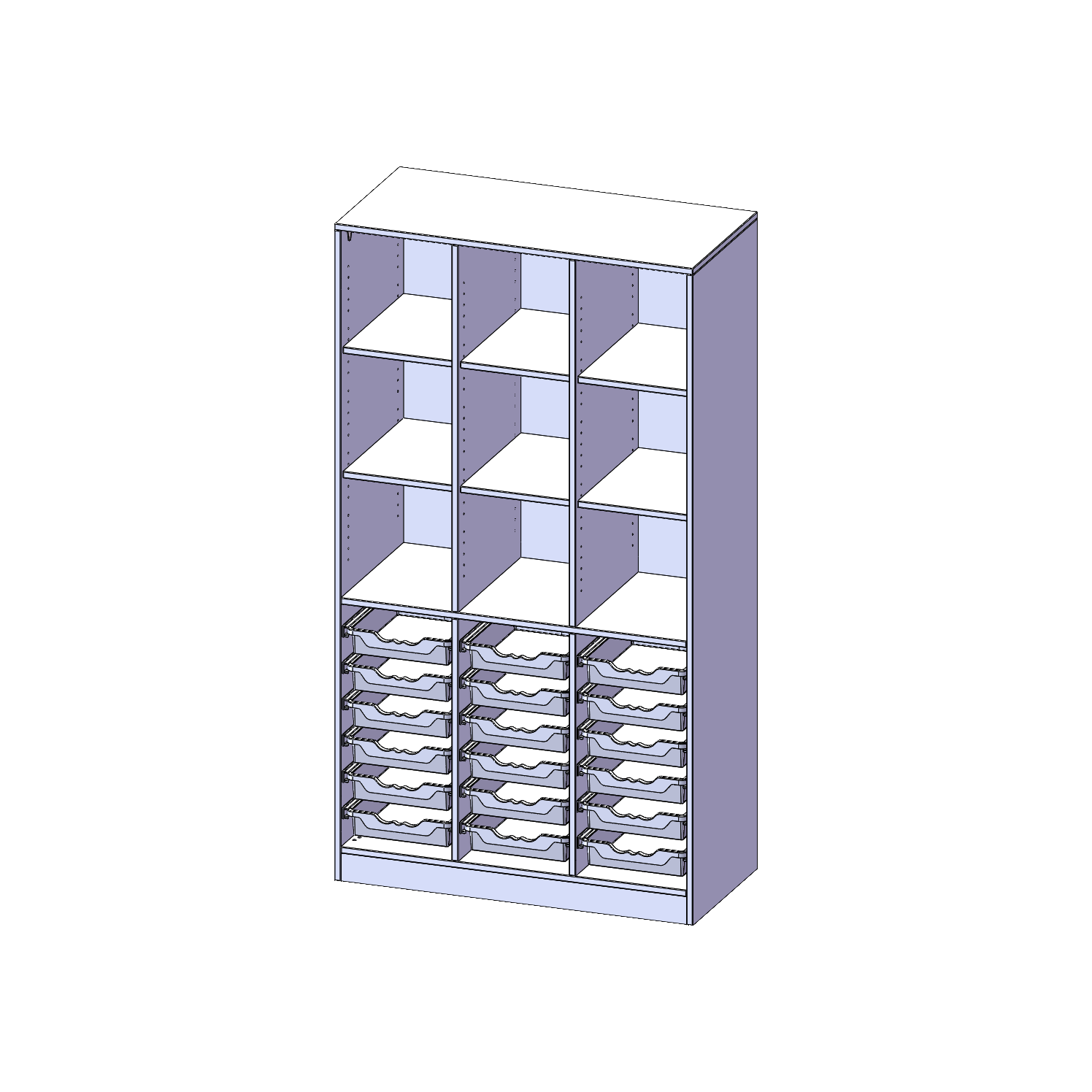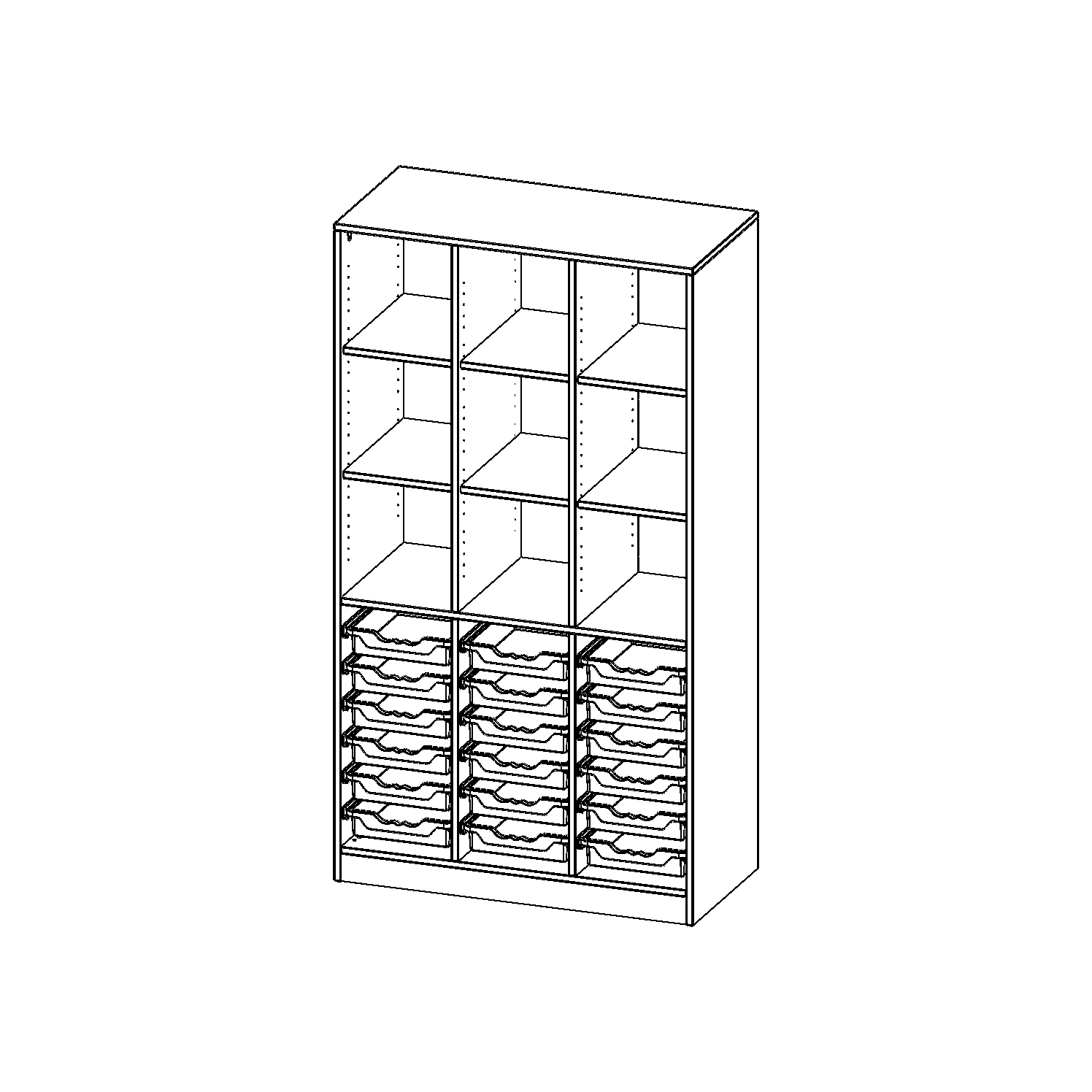 B/H/T: 104,5x190x50 cm, mit Sockel (81 mm) und Mittelwand, unten 18 flache ErgoTray Boxen, oben 6 Einlegeböden