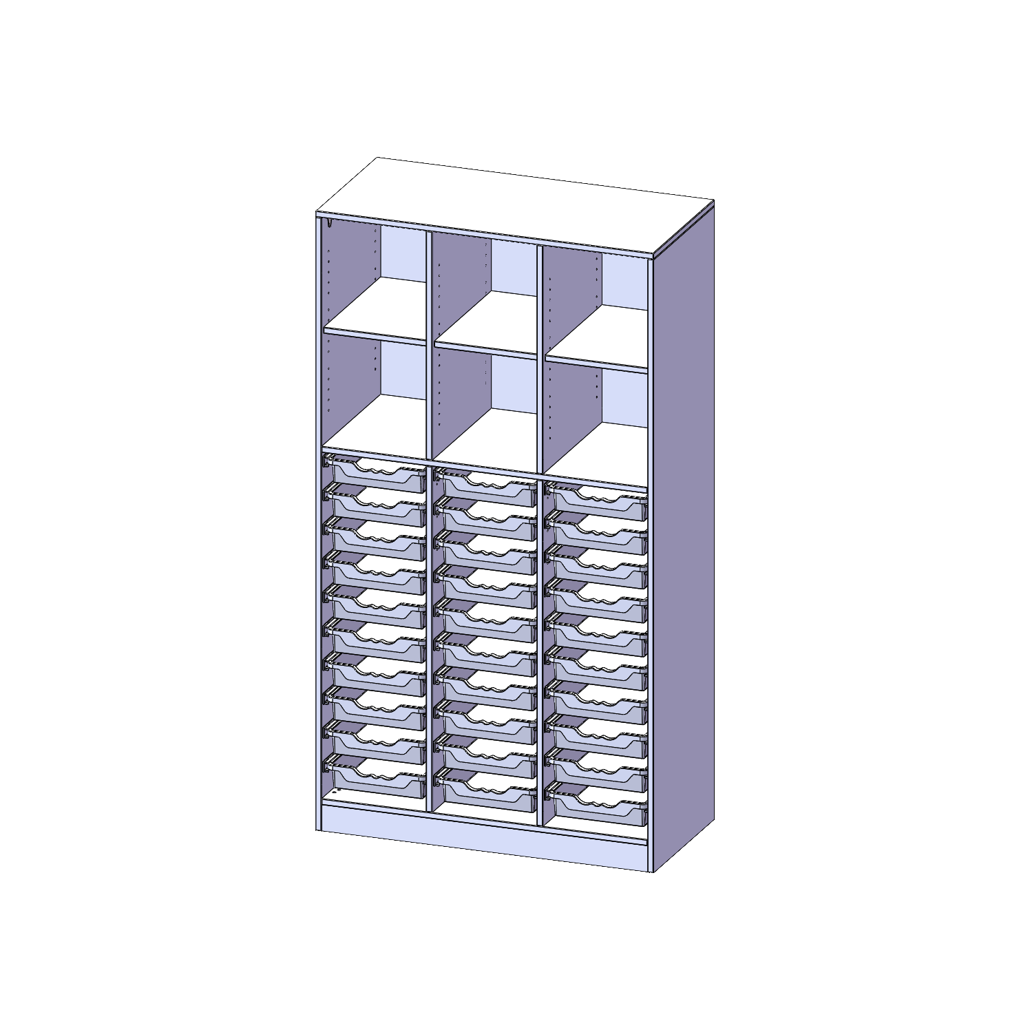 B/H/T: 104,5x190x50 cm, mit Sockel (81 mm) und Mittelwand, unten 30 flache ErgoTray Boxen, oben 3 Einlegeböden