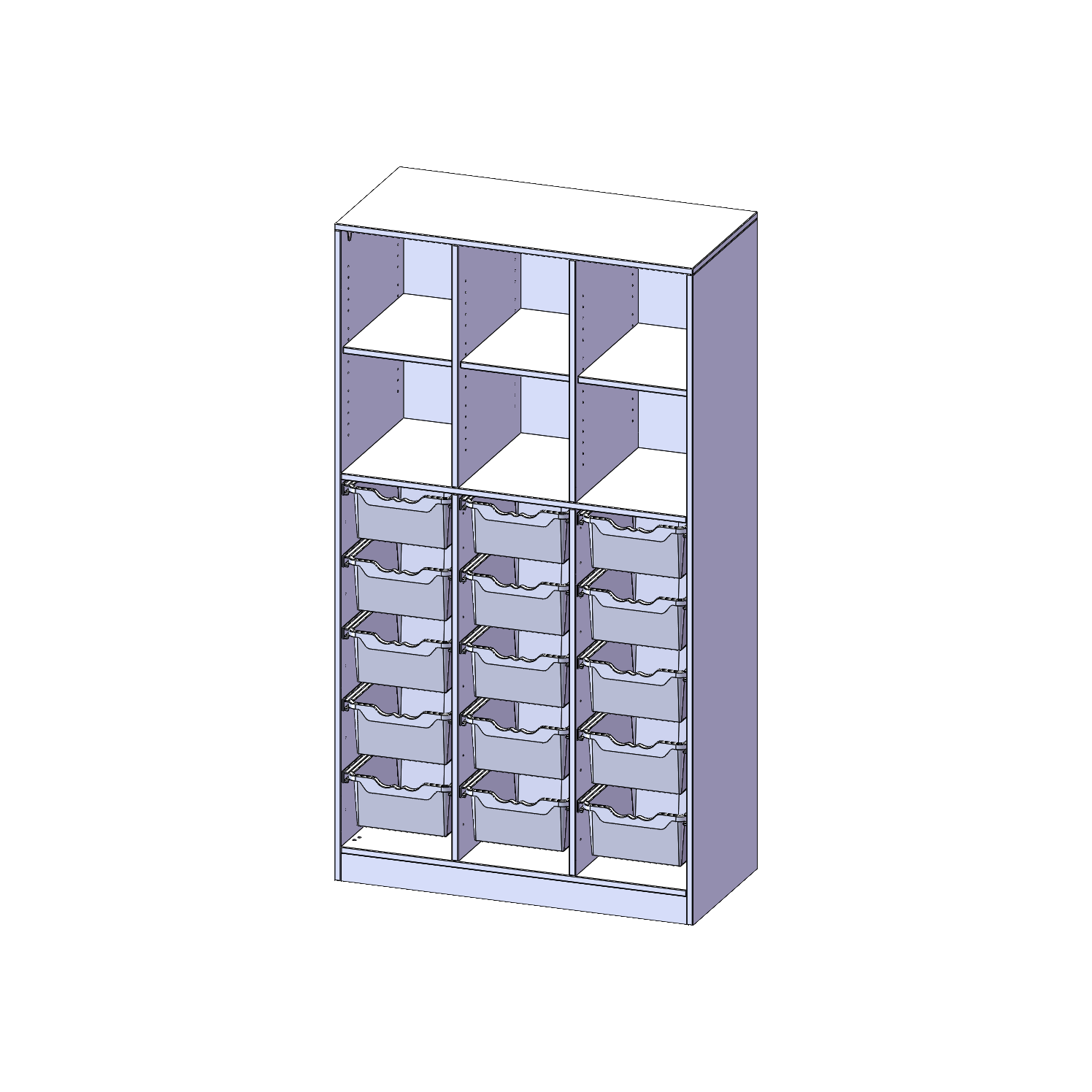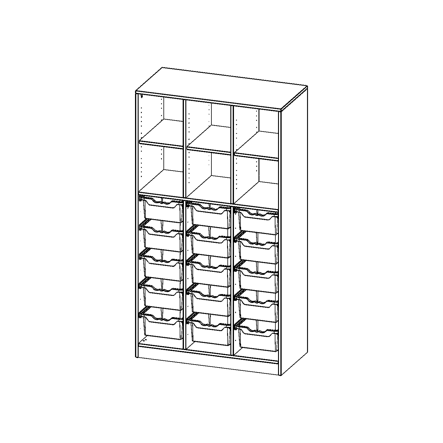 B/H/T: 104,5x190x50 cm, mit Sockel (81 mm) und Mittelwand, unten 15 hohe ErgoTray Boxen, oben 3 Einlegeböden