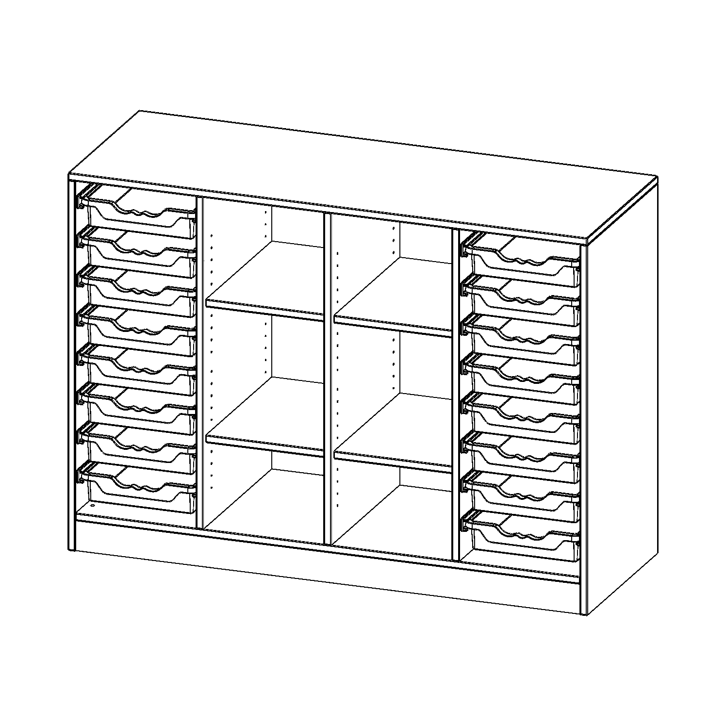 B/H/T: 138,7x100x50 cm, mit Sockel (81 mm), rechts und links je 8 flache ErgoTray Boxen, in der Mitte 6 offene Fächer