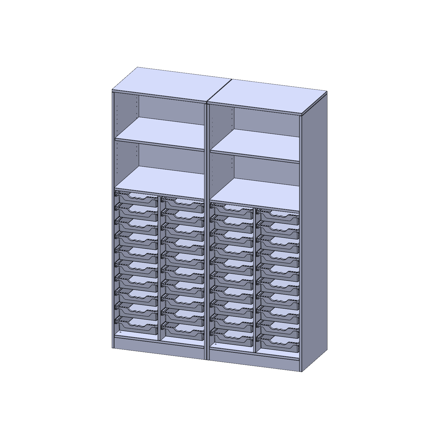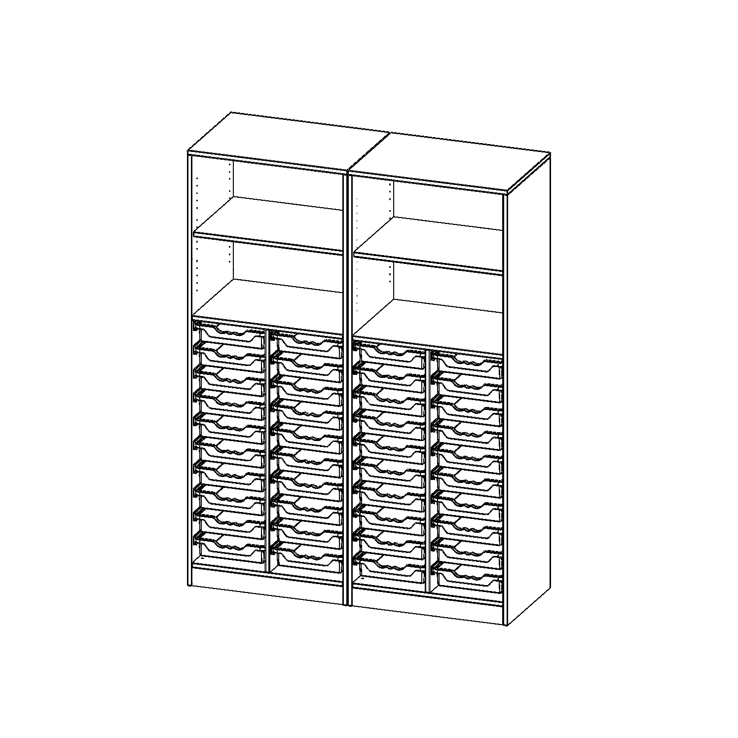 B/H/T: 140,6x190x50 cm, mit Sockel (81 mm), zweiteilig, unten 40 flache ErgoTray Boxen, oben 2 Einlegeböden