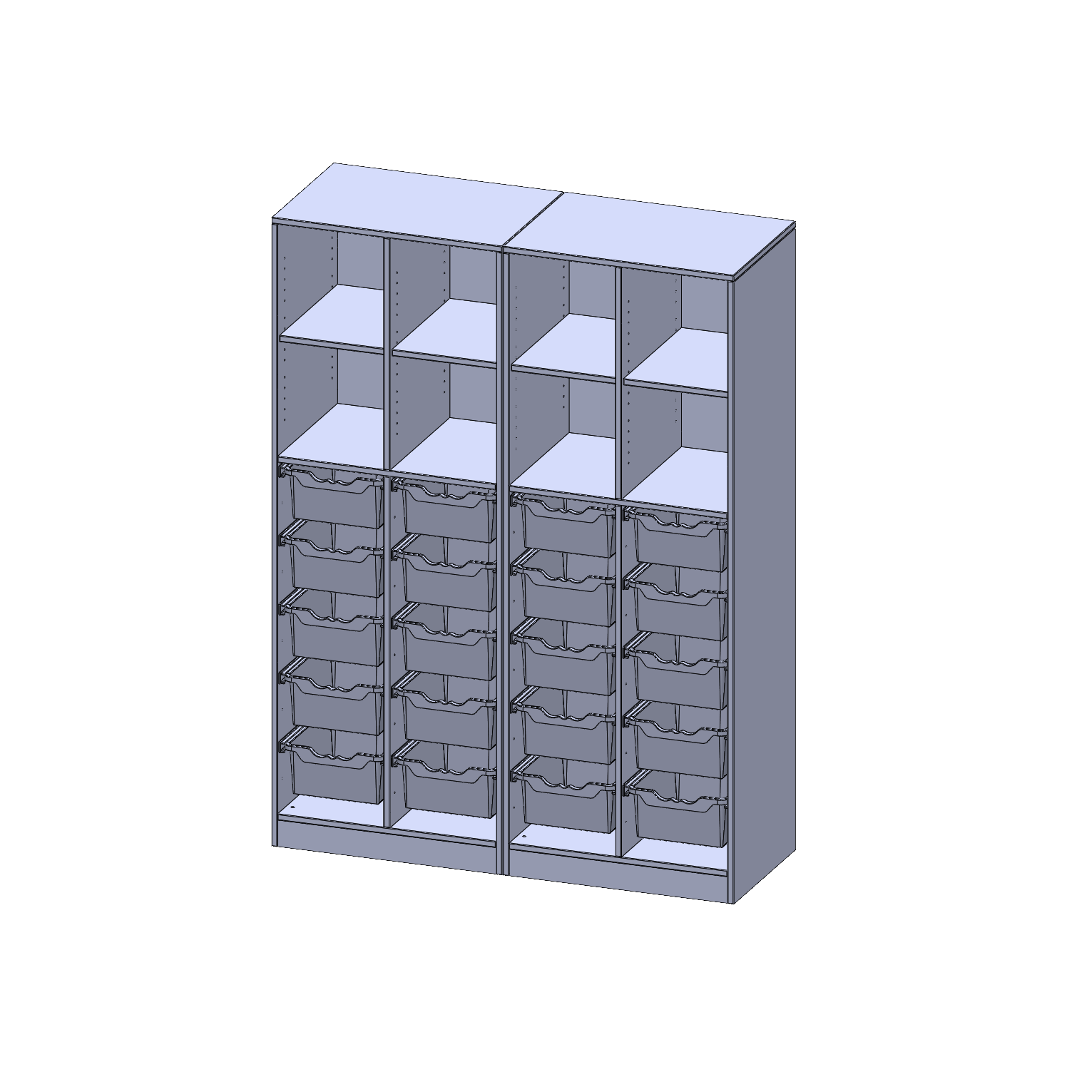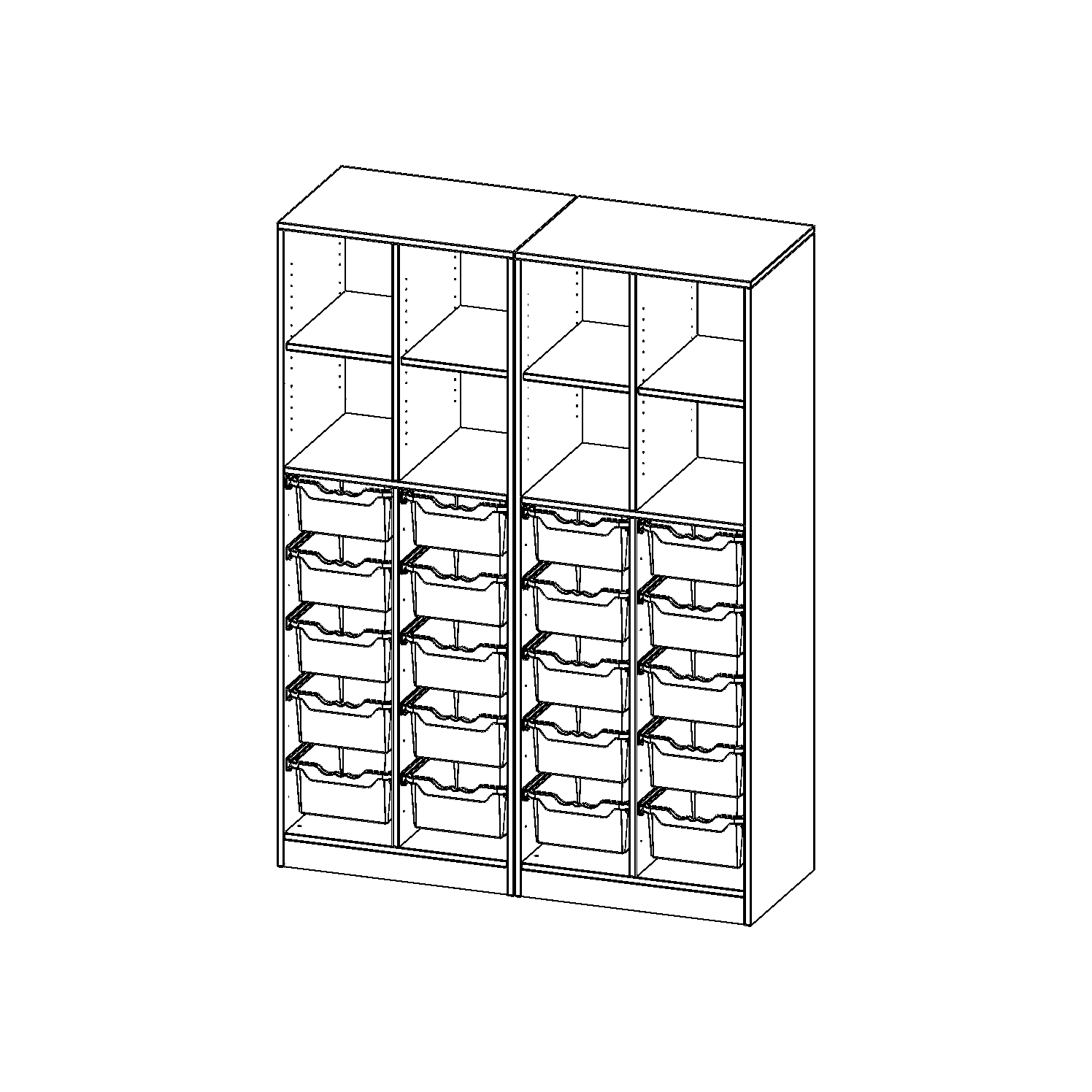 B/H/T: 140,6x190x50 cm, mit Sockel (81 mm), zweiteilig und Mittelwand, unten 20 hohe ErgoTray Boxen, oben 4 Einlegeböden