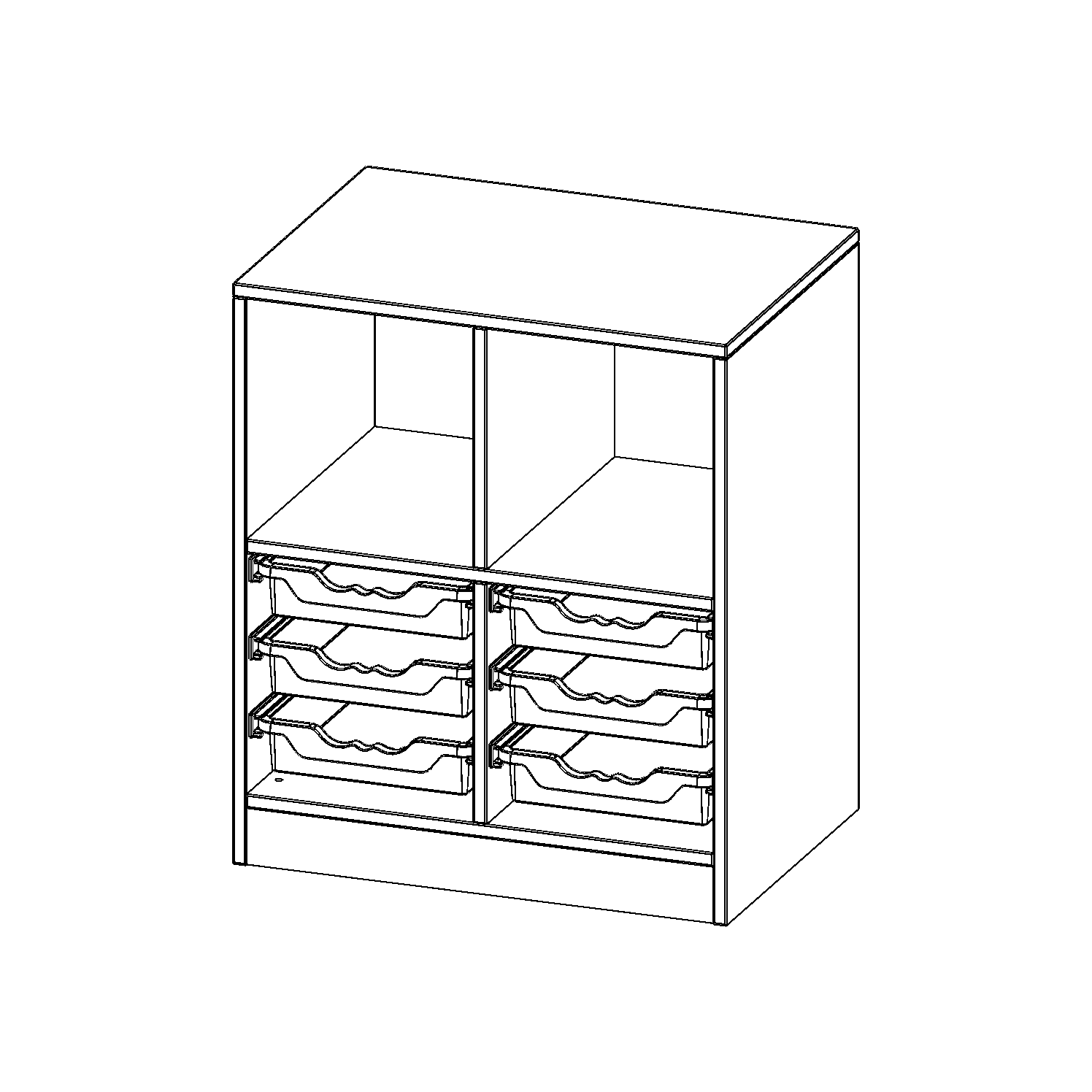 B/H/T: 70,3x82x50 cm, mit Sockel (81 mm), oben 2 Fächer, unten 6 flache ErgoTray Boxen
