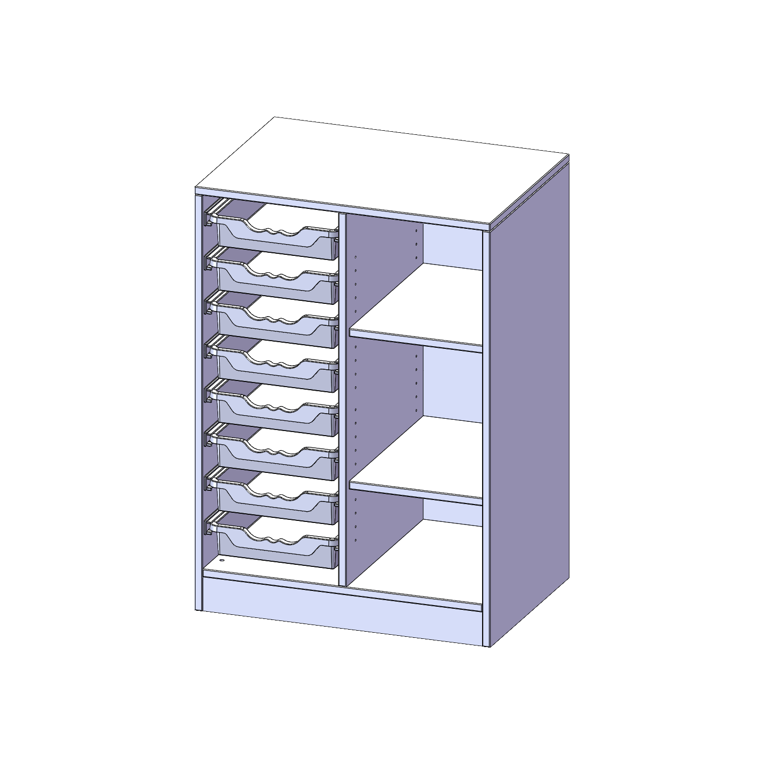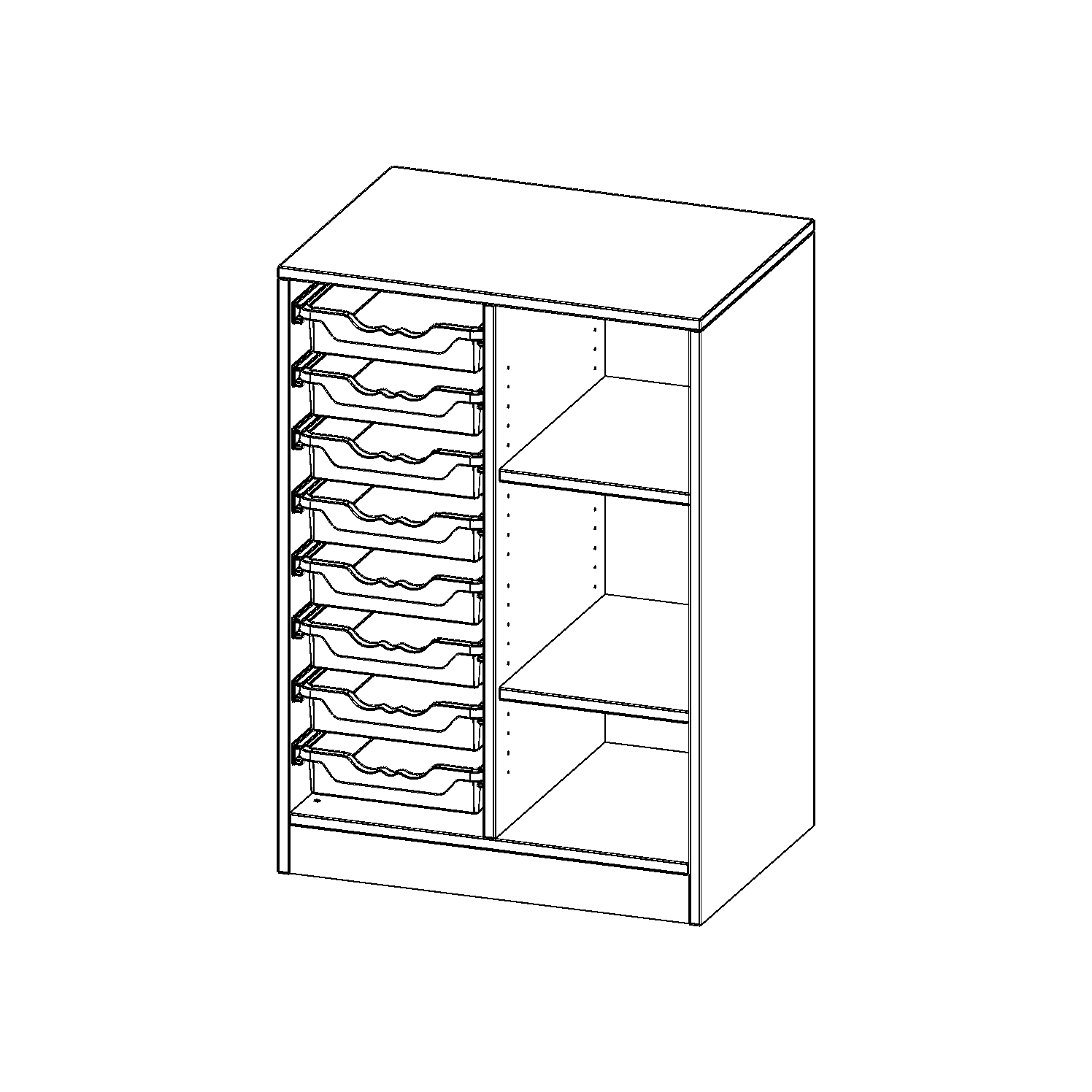 B/H/T: 70,3x100x50 cm, mit Sockel (81 mm), rechts 3 Fächer, links 8 flache ErgoTray Boxen
