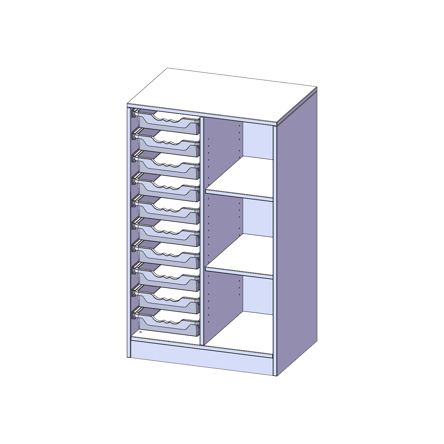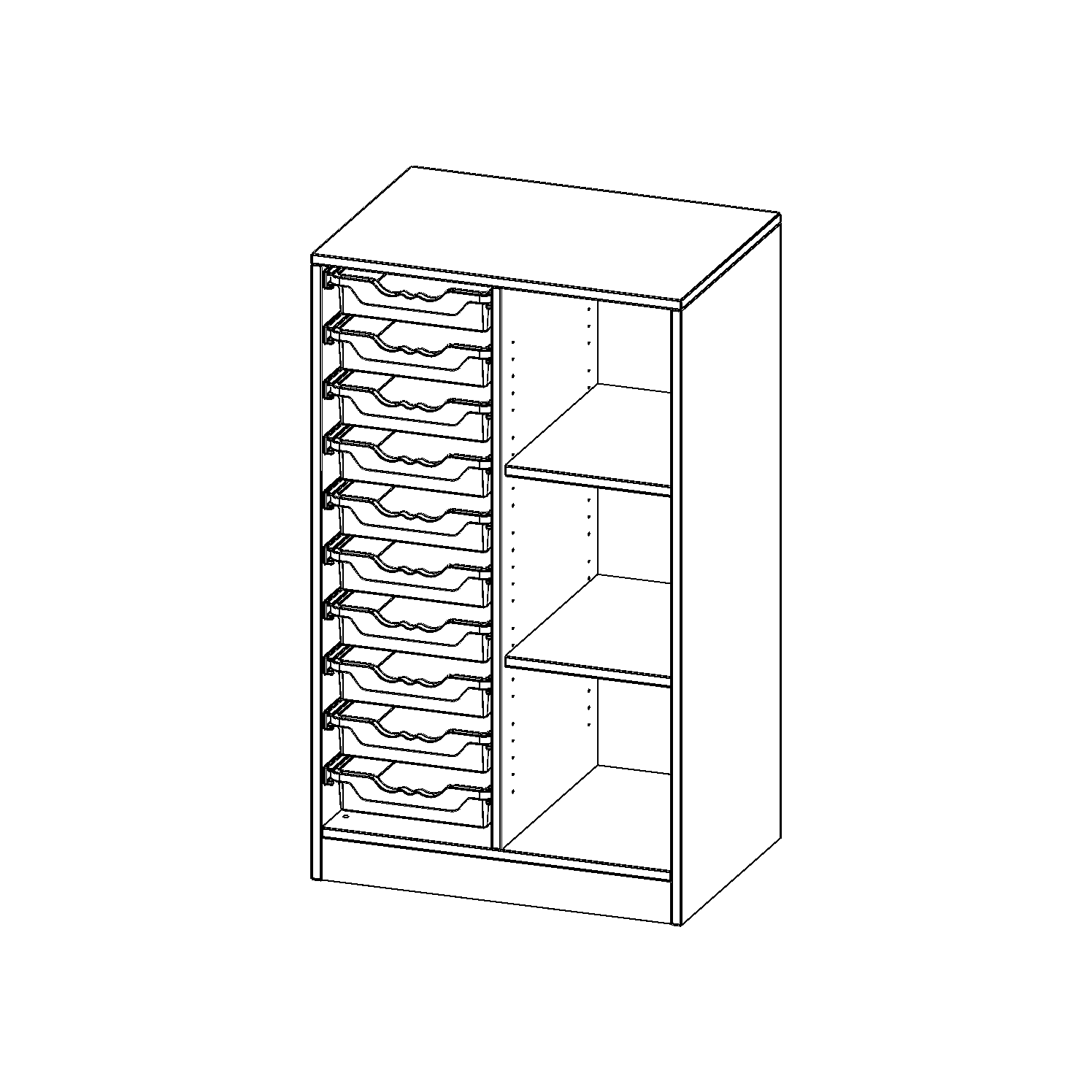 B/H/T: 70,3x118x50 cm, mit Sockel (81 mm), rechts 3 Fächer, links 10 flache ErgoTray Boxen