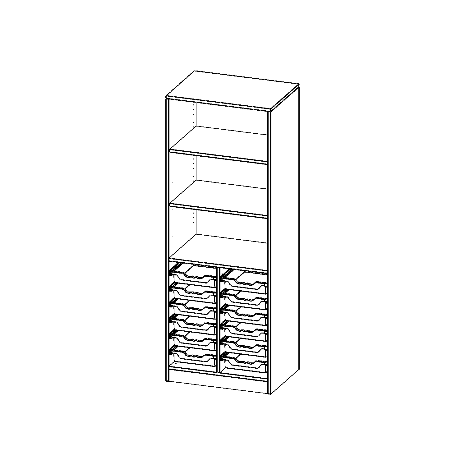 B/H/T: 70,3x190x50 cm, mit Sockel (81 mm), unten 12 flache ErgoTray Boxen, oben 2 Einlegeböden