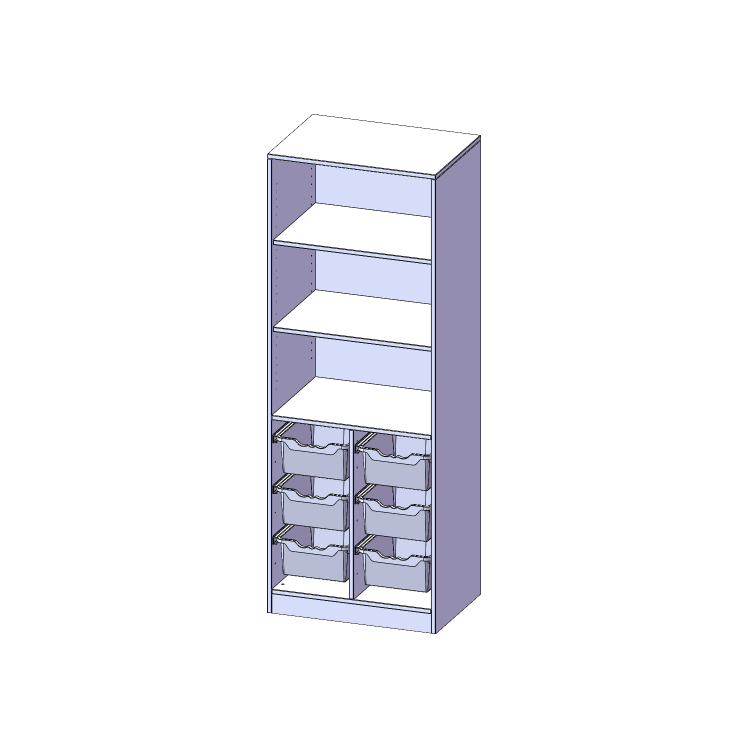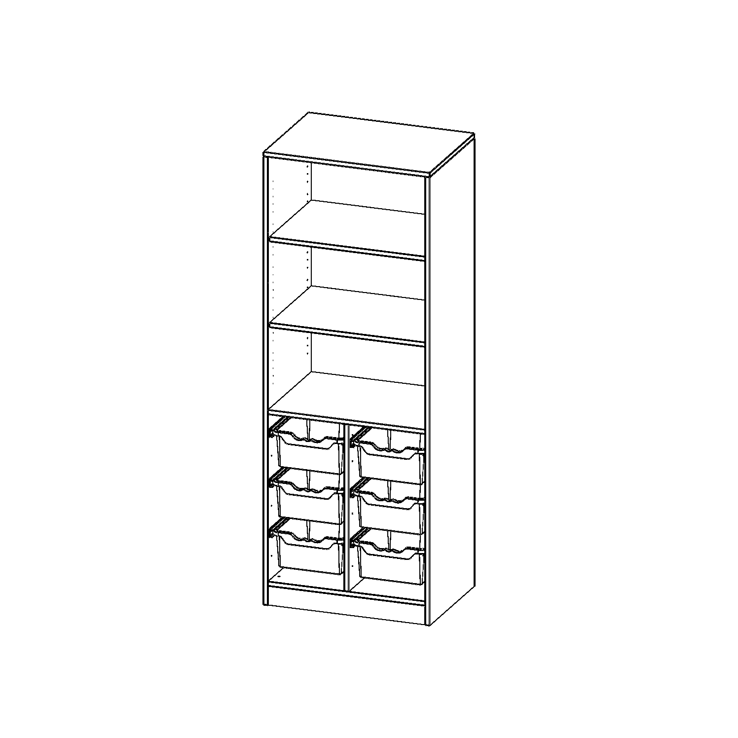 B/H/T: 70,3x190x50 cm, mit Sockel (81 mm), unten 6 hohe ErgoTray Boxen, oben 2 Einlegeböden