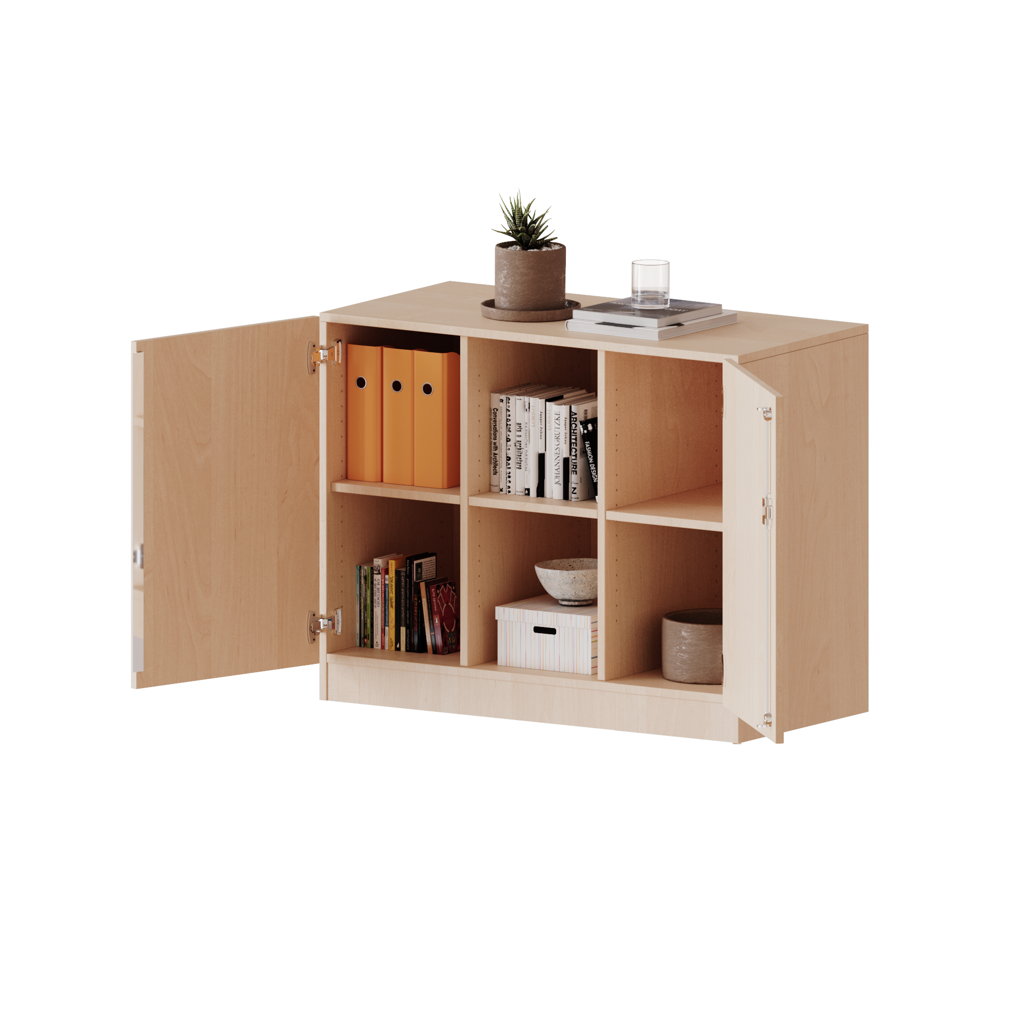 Alle Schränke werden aus melaminharzbeschichteter E1-Feinspanplatte gefertigt, die FSC zertifiziert und formaldehydfrei sind. Als Kanten verwenden wir besonders robuste 2 mm starke ABS Kanten, die unter hoher Temperatur fest verleimt werden. Bitte wählen Sie Ihr Wunschdekor aus unserer Dekorpalette aus. Die Einlegeböden sind im Raster von 32 mm verstellbar. Unsere hochwertigen Bodenträger verfügen über einen "Ausziehstop", so wird verhindert, dass Böden mit Inhalt darauf aus dem Regal oder Schrank rutschen können. Die Türen lassen sich dank 270° öffnender Scharniere an den Korpus anlegen. Sie sind mit einem Schloss verschließbar. An den Türen befindet sich eine Staublippe.
