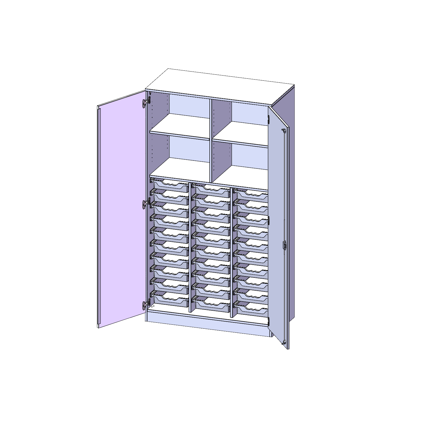 B/H/T: 104,5x190x50 cm, zweitürig, mit Sockel (81 mm), mit Mittelwand, mit 30 flachen ErgoTray Boxen