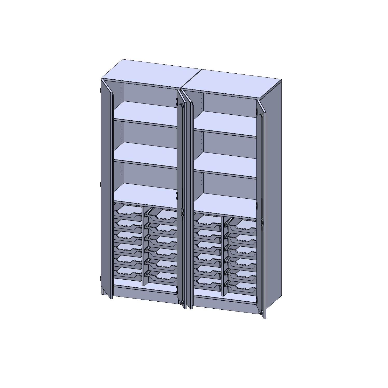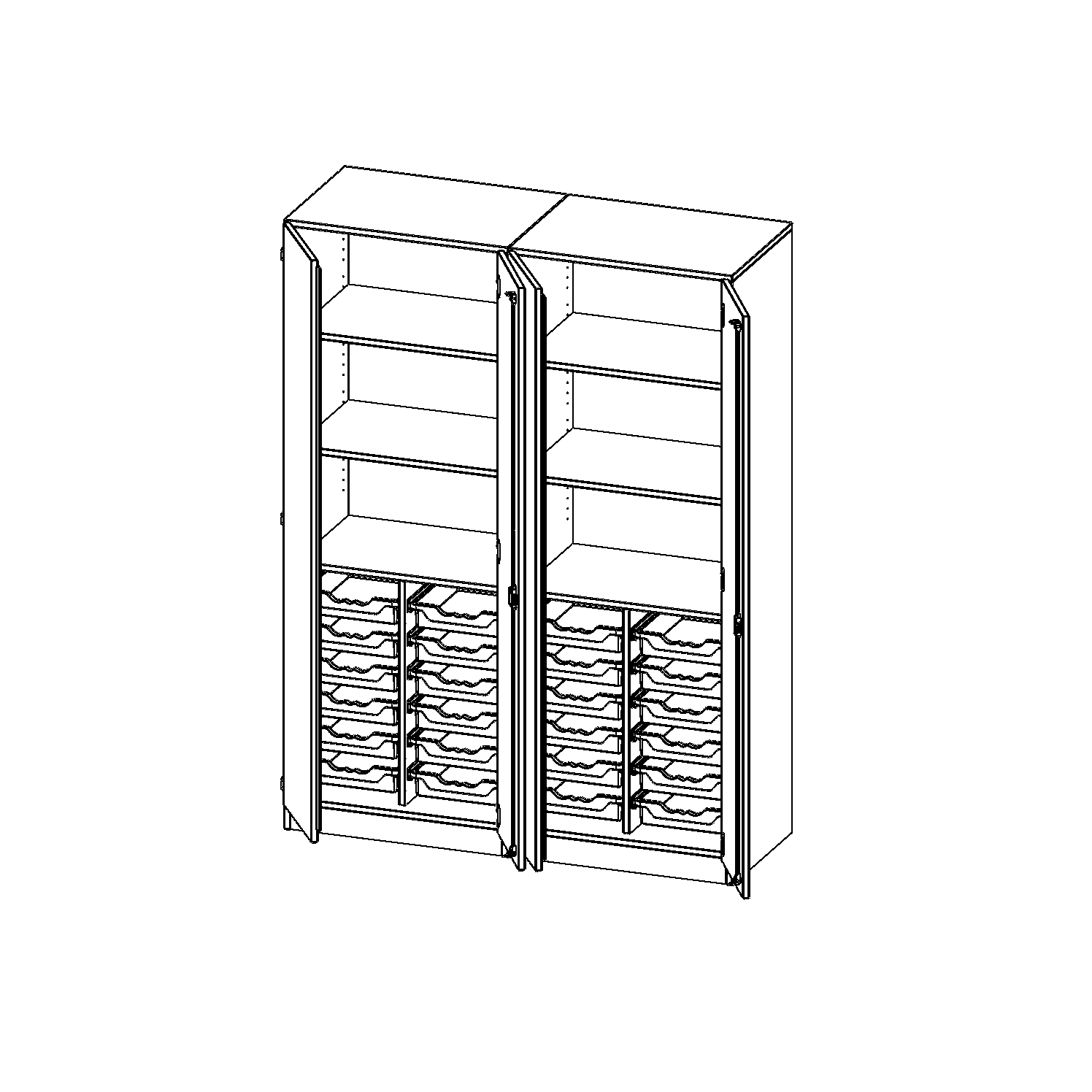 B/H/T: 140,6x190x50 cm, viertürig, zweiteilig, mit Sockel (81 mm), mit Mittelwand, mit 24 flachen ErgoTray Boxen