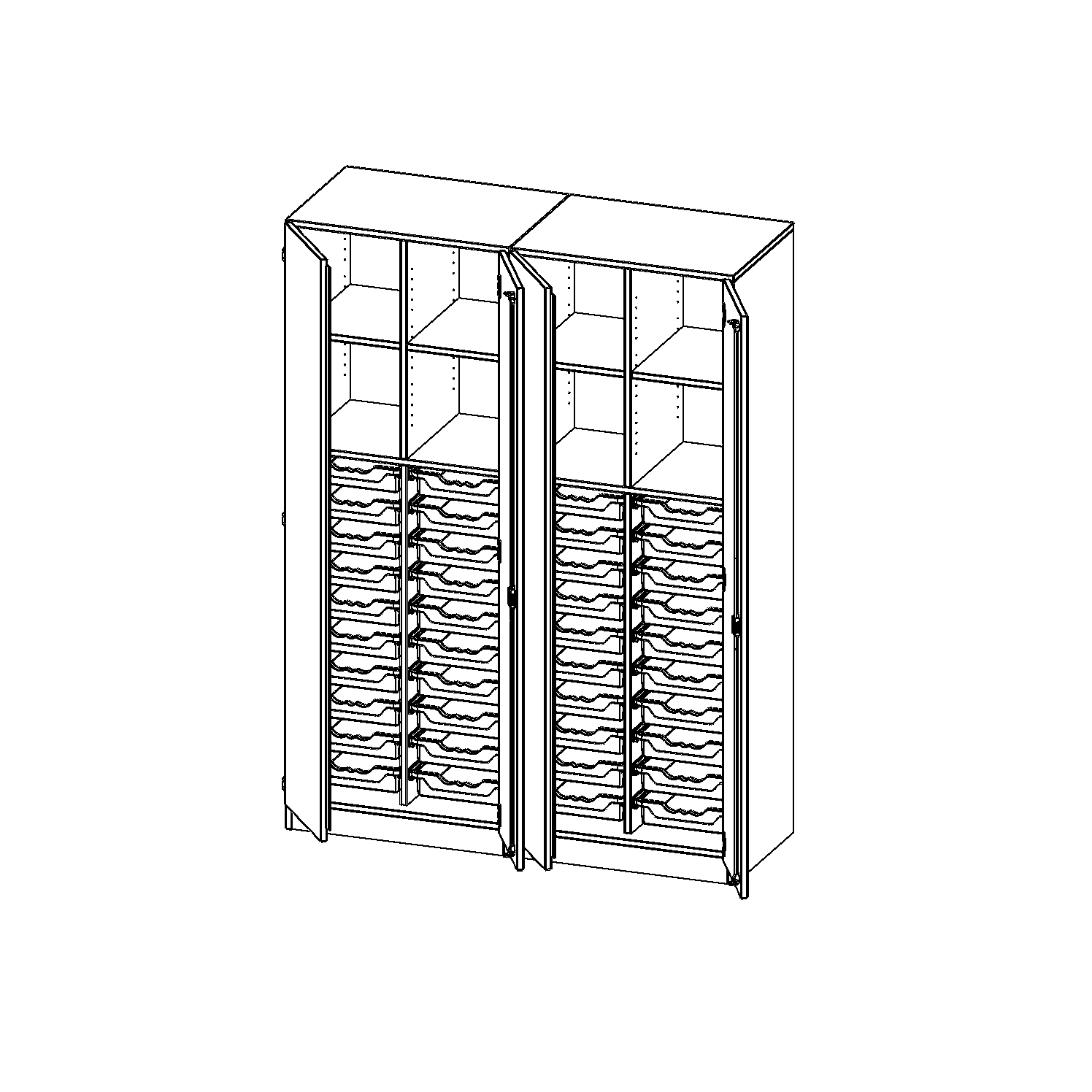 B/H/T: 140,6x190x50 cm, viertürig, zweiteilig, mit Sockel (81 mm), mit 2 Mittelwänden, mit 40 flachen ErgoTray Boxen