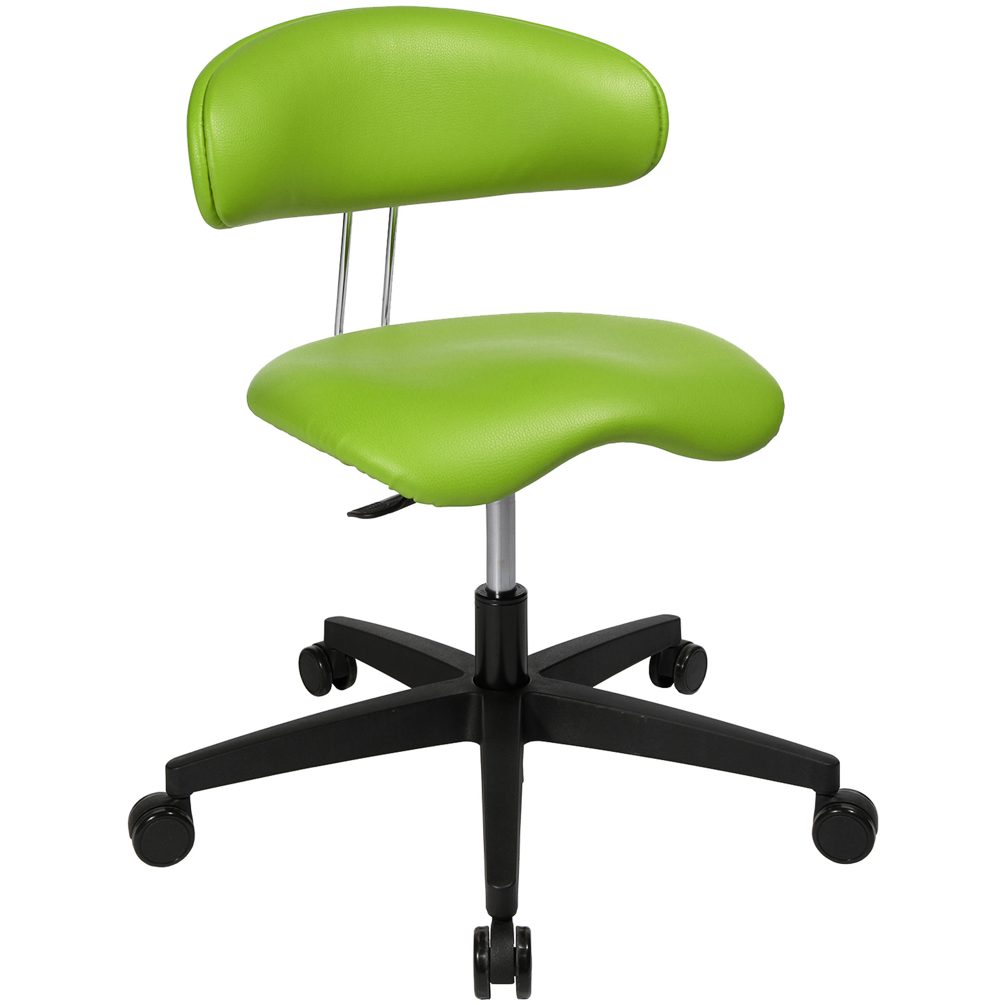 Beim ergonomischen Hocker „KIHO“ handelt es sich um ein Made-in-Germany-Produkt von TOPSTAR® mit GS-Zeichen. Die Besonderheit ist die stufenlose Sitzhöhenverstellung mit Toplift bis zu einer niedrigen Sitzhöhe von lediglich 34 cm auf Augenhöhe der Kleinen. Der Drehhocker mit Hartbodenrollen ist bestens für Laminat, Holz- oder Steinböden geeignet, das 5armige Fußkreuz besteht aus schwarzem Kunststoff. Der Orthositz in orthopädischer Sattelsitzform fördert ein gesundes ermüdungsfreies Sitzen. Darüber hinaus ist die ergonomische Rückenlehne zur Unterstützung einer gesunden Rückenhaltung stufenlos höhen- und tiefenverstellbar. Der Hocker ist außer einer Lehne mit lastabhängig gebremsten Sicherheitsdoppelrollen für Hartböden wie Laminat, Holz, Stein ausgestattet. Dadurch rollt der Stuhl nur unter Belastung, in unbelastetem Zustand bremsen die Rollen, um ein ungewolltes Wegrollen zu verhindern, sie können bei Bedarf jedoch problemlos durch Teppichbodenrollen getauscht oder ausgewechselt werden (unsere Artikel-Nr. WBR-ROLLEN). Beim Bezug mit Softex handelt es sich um ein extra strapazierfähiges, langlebiges und abwischbares Kunstleder.