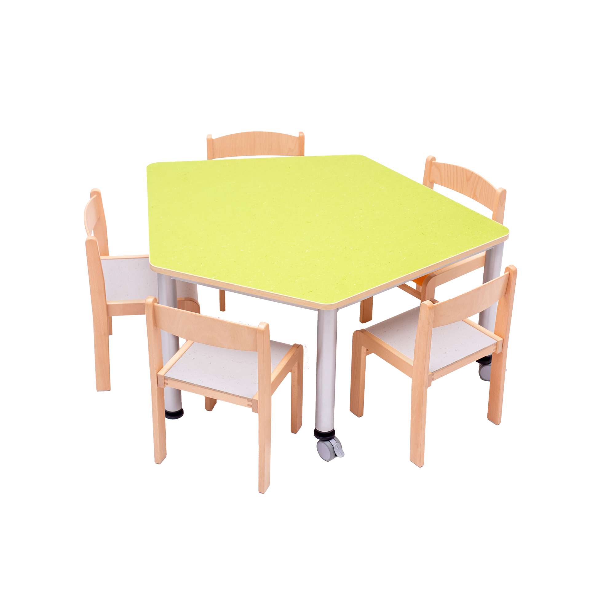 Der praktische, fahrbare Fünfecktisch besitzt ein stabiles Stahlzargengestell mit Rundrohr-Füssen im Ø 60 mm. Mit seinen unterschiedlichen Seitenlängen ist er überall dort, wo Flexibilität, Mobilität und moderne Formensprache gewünscht sind, überzeugend einsetzbar. 2 Füsse haben Rollen zum einfachen Verfahren des Tisches. Die Farben des Stahlgestells können nach dem Farbkonzept des Raumes ausgewählt werden. Der strapazierfähige Linoleumbelag ist leicht zu reinigen, geräuschdämmend und kann zugleich als ein schöner Farbkontrast gewählt werden. Die Ecken der Tischplatte sind sicherheitsbewußt großzügig gerundet und die Kanten werden mit einer 2 mm dicken ABS-Sicherheitskante ausgestattet. Diese kann gegen Aufpreis auch abweichend vom Plattendekor ausgeführt werden (AP KANTE). Die verfügbaren Tischhöhen lauten [cm]: 41, 46, 53, 59, 64, 71 und 76 cm. Bitte vermerken Sie diese Zahl bei Bestellung hinter der Artikel-Nummer.