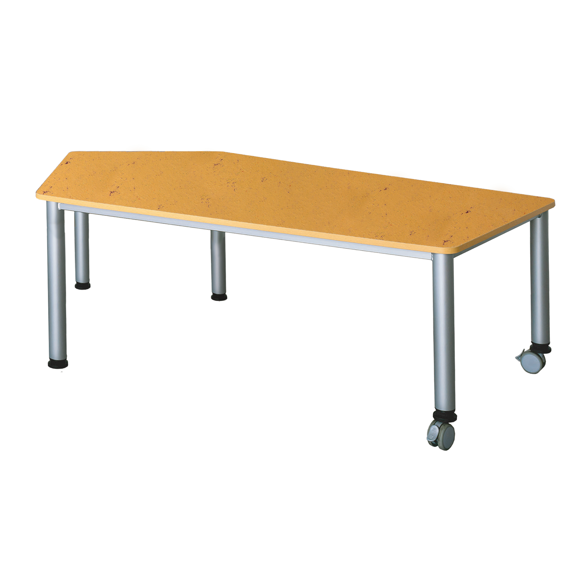 Der praktische, fahrbare Fünfecktisch besitzt ein stabiles Stahlzargengestell mit Rundrohr-Füssen im Ø 60 mm. Mit seinen unterschiedlichen Seitenlängen ist er überall dort, wo Flexibilität, Mobilität und moderne Formensprache gewünscht sind, überzeugend einsetzbar. 2 Füsse haben Rollen zum einfachen Verfahren des Tisches. Die Farben des Stahlgestells können nach dem Farbkonzept des Raumes ausgewählt werden. Der strapazierfähige Linoleumbelag ist leicht zu reinigen, geräuschdämmend und kann zugleich als ein schöner Farbkontrast gewählt werden. Die Ecken der Tischplatte sind sicherheitsbewußt großzügig gerundet und die Kanten werden mit einer 2 mm dicken ABS-Sicherheitskante ausgestattet. Diese kann gegen Aufpreis auch abweichend vom Plattendekor ausgeführt werden (AP KANTE). Die verfügbaren Tischhöhen lauten [cm]: 41, 46, 53, 59, 64, 71 und 76 cm. Bitte vermerken Sie diese Zahl bei Bestellung hinter der Artikel-Nummer.