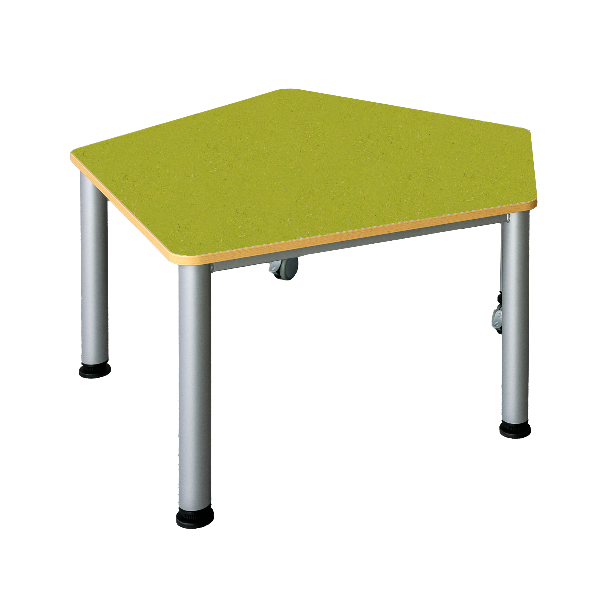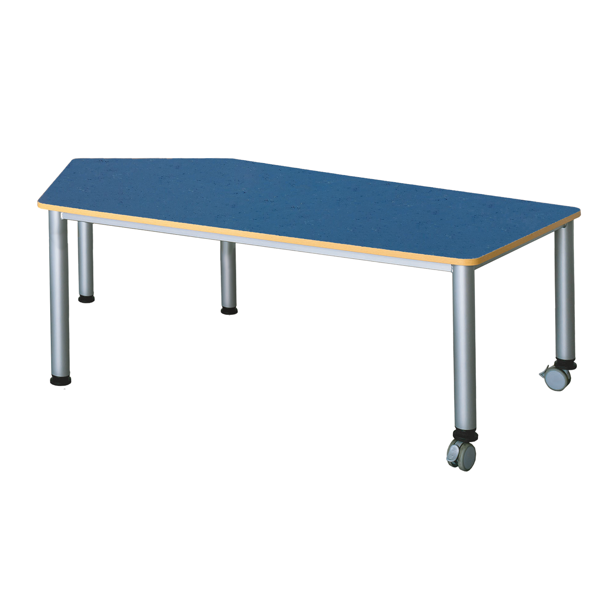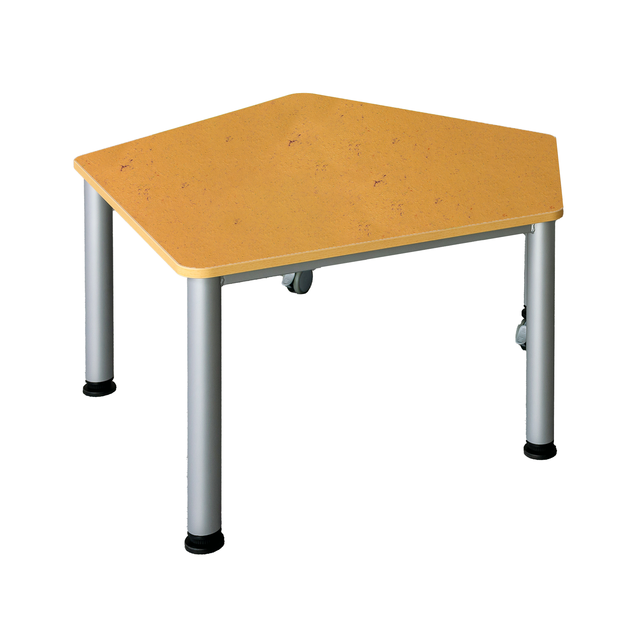 Der praktische, fahrbare Fünfecktisch besitzt ein stabiles Stahlzargengestell mit Rundrohr-Füssen im Ø 60 mm. Mit seinen unterschiedlichen Seitenlängen ist er überall dort, wo Flexibilität, Mobilität und moderne Formensprache gewünscht sind, überzeugend einsetzbar. 2 Füsse haben Rollen zum einfachen Verfahren des Tisches. Die Farben des Stahlgestells können nach dem Farbkonzept des Raumes ausgewählt werden. Der strapazierfähige Linoleumbelag ist leicht zu reinigen, geräuschdämmend und kann zugleich als ein schöner Farbkontrast gewählt werden. Die Ecken der Tischplatte sind sicherheitsbewußt großzügig gerundet und die Kanten werden mit einer 2 mm dicken ABS-Sicherheitskante ausgestattet. Diese kann gegen Aufpreis auch abweichend vom Plattendekor ausgeführt werden (AP KANTE). Die verfügbaren Tischhöhen lauten [cm]: 41, 46, 53, 59, 64, 71 und 76 cm. Bitte vermerken Sie diese Zahl bei Bestellung hinter der Artikel-Nummer.