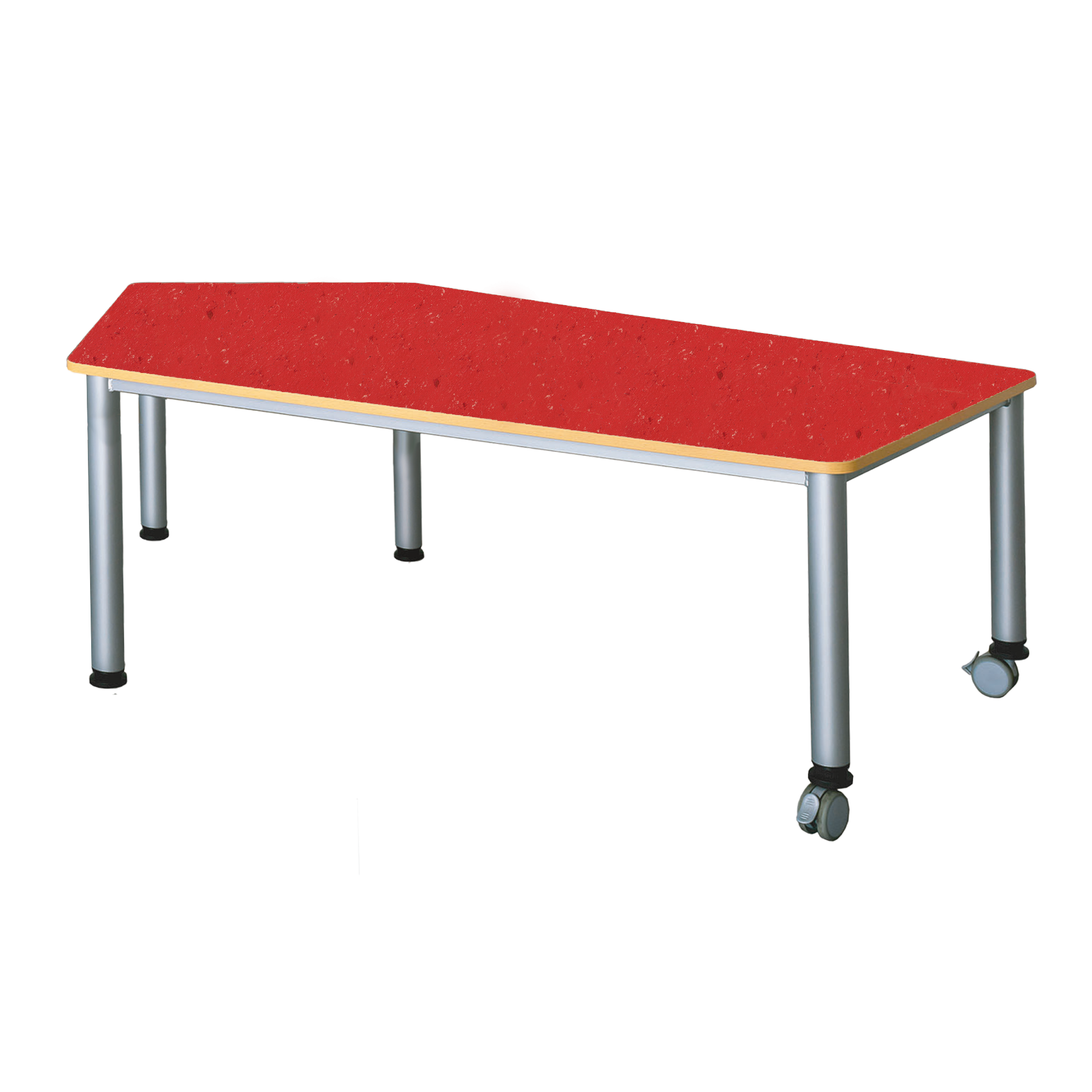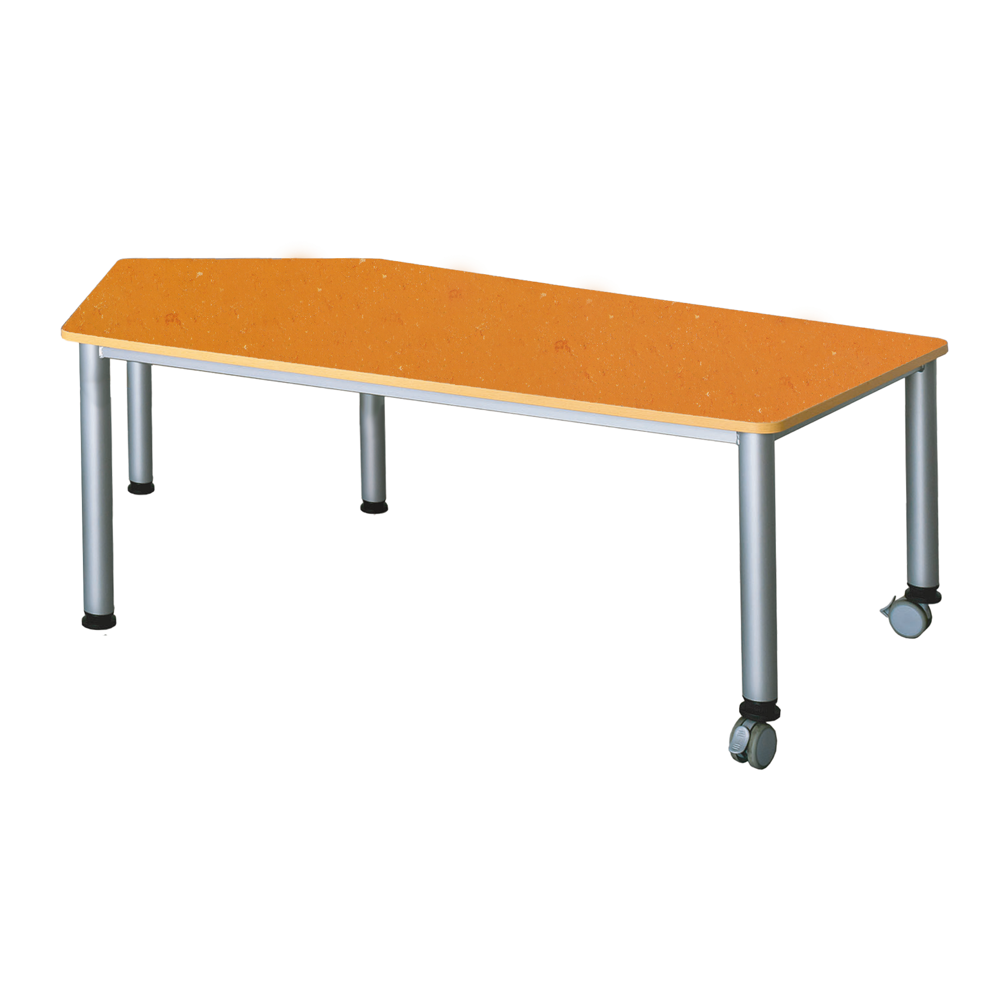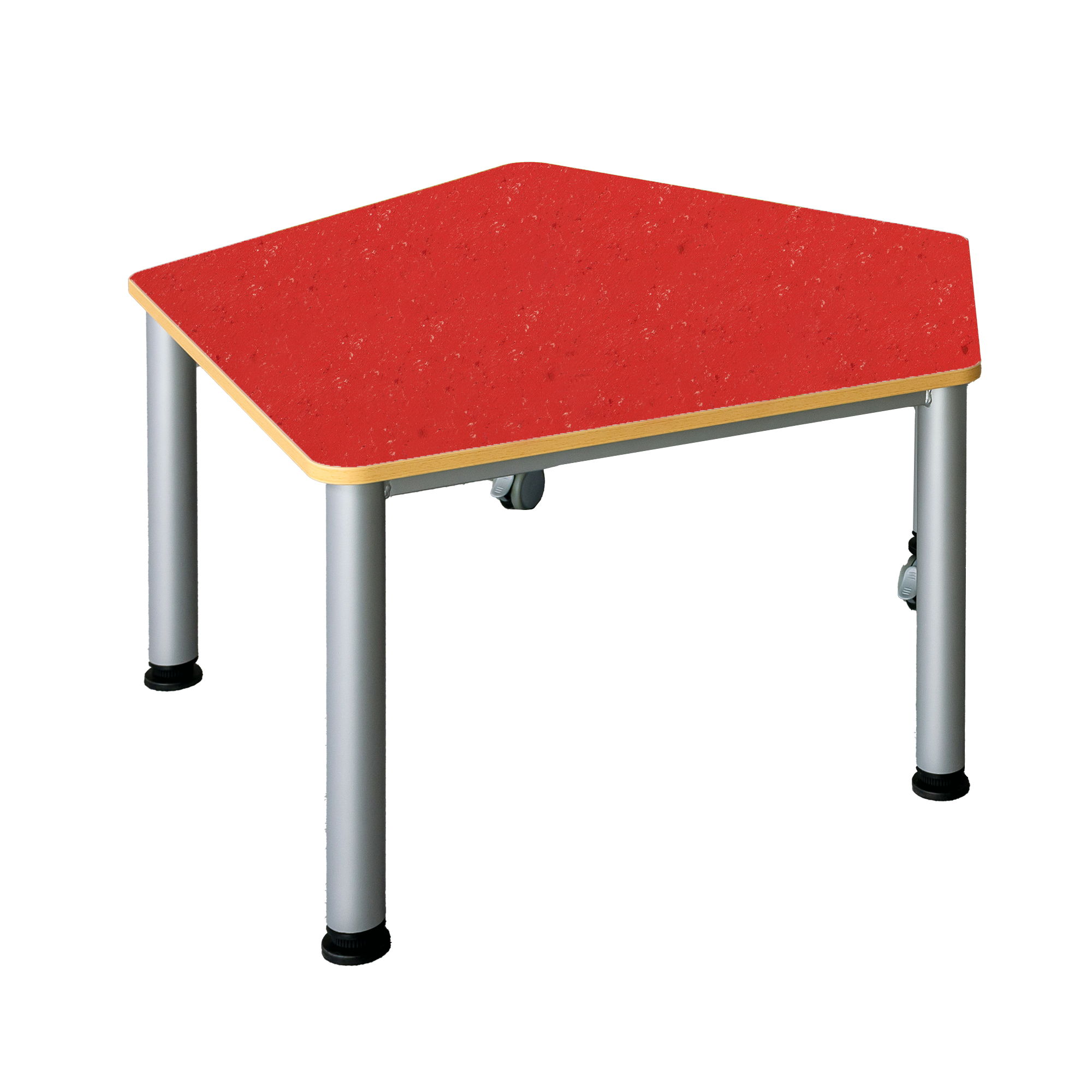 Der praktische, fahrbare Fünfecktisch besitzt ein stabiles Stahlzargengestell mit Rundrohr-Füssen im Ø 60 mm. Mit seinen unterschiedlichen Seitenlängen ist er überall dort, wo Flexibilität, Mobilität und moderne Formensprache gewünscht sind, überzeugend einsetzbar. 2 Füsse haben Rollen zum einfachen Verfahren des Tisches. Die Farben des Stahlgestells können nach dem Farbkonzept des Raumes ausgewählt werden. Der strapazierfähige Linoleumbelag ist leicht zu reinigen, geräuschdämmend und kann zugleich als ein schöner Farbkontrast gewählt werden. Die Ecken der Tischplatte sind sicherheitsbewußt großzügig gerundet und die Kanten werden mit einer 2 mm dicken ABS-Sicherheitskante ausgestattet. Diese kann gegen Aufpreis auch abweichend vom Plattendekor ausgeführt werden (AP KANTE). Die verfügbaren Tischhöhen lauten [cm]: 41, 46, 53, 59, 64, 71 und 76 cm. Bitte vermerken Sie diese Zahl bei Bestellung hinter der Artikel-Nummer.