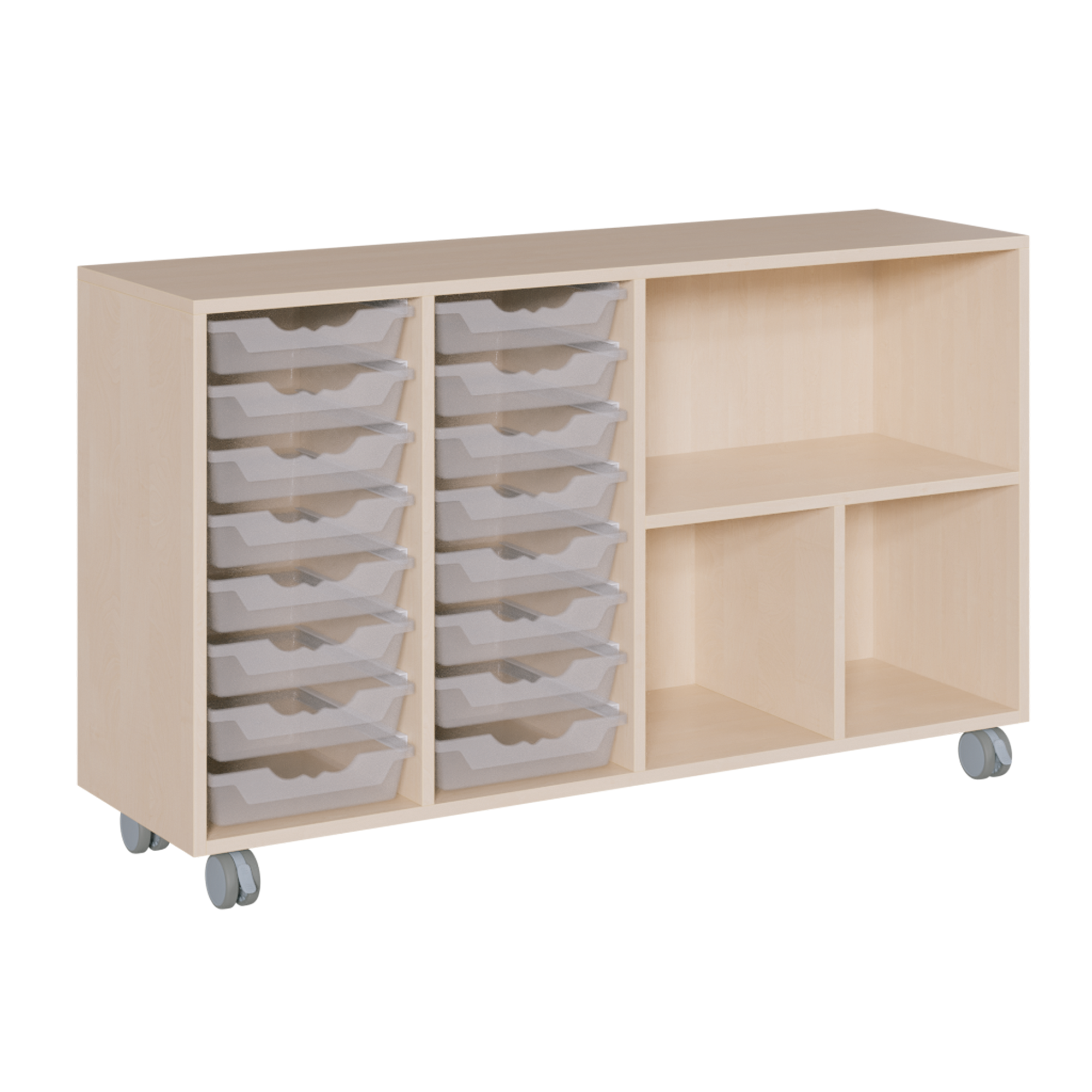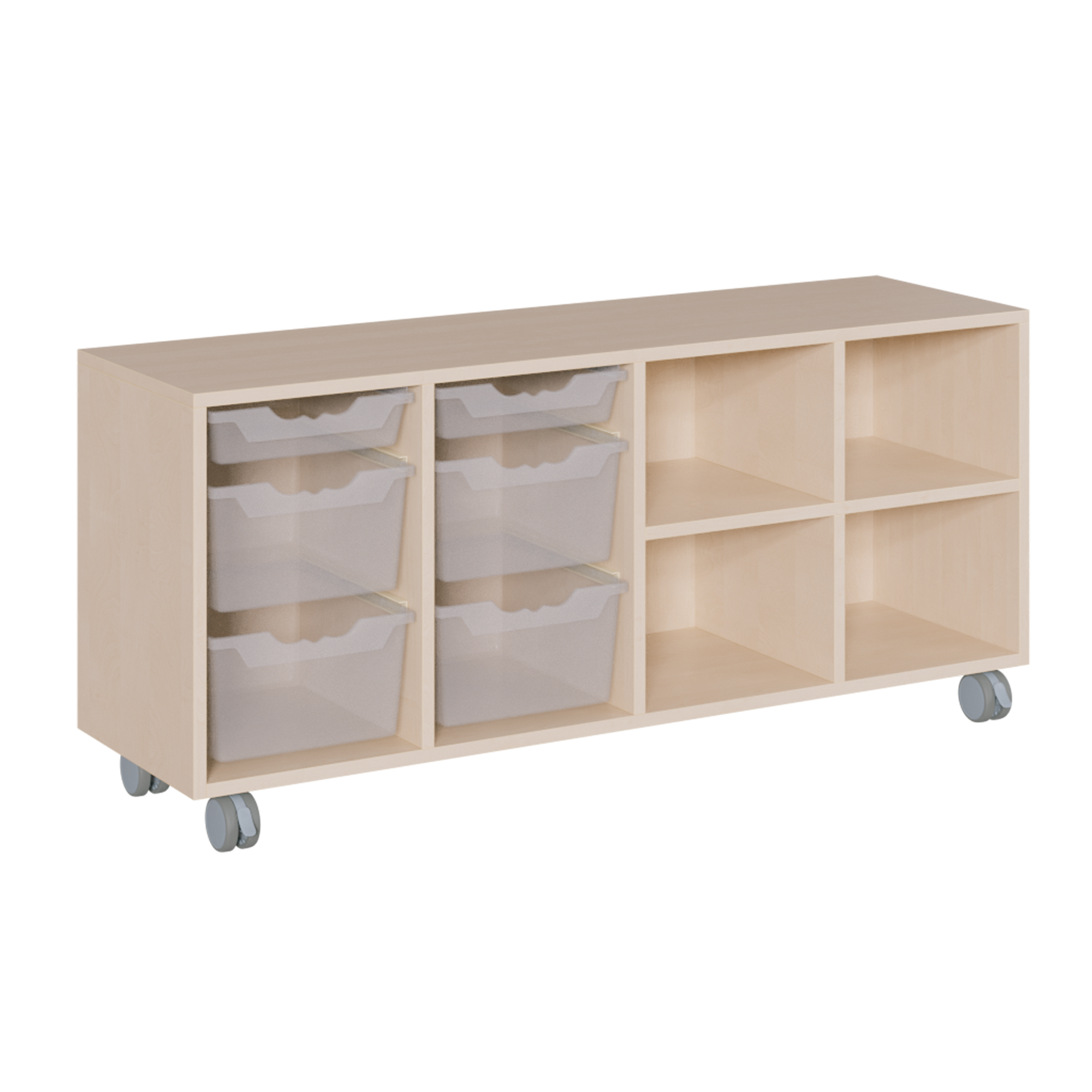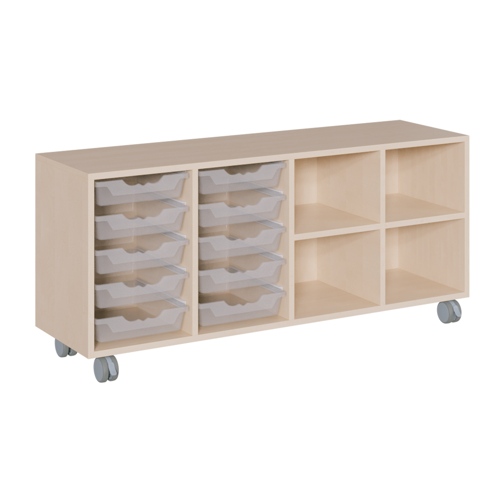 Die vierreihigen fahrbaren Regale in der kombinierten Bauweise von Boxen- und Regalbereichen in verschiedenen Höhen bieten die Möglichkeiten für die unterschiedlichsten Einsatzzwecke. Die Trennwände bilden eine Vierteilung für die unterschiedliche Größe und Anzahl der ErgoTray-Boxen und zusätzlichen Regalbereichen. Die Rückwand ist als Sichtrückwand ausgeführt, dementsprechend ist die Eignung der Regale als Raumteiler gegeben.