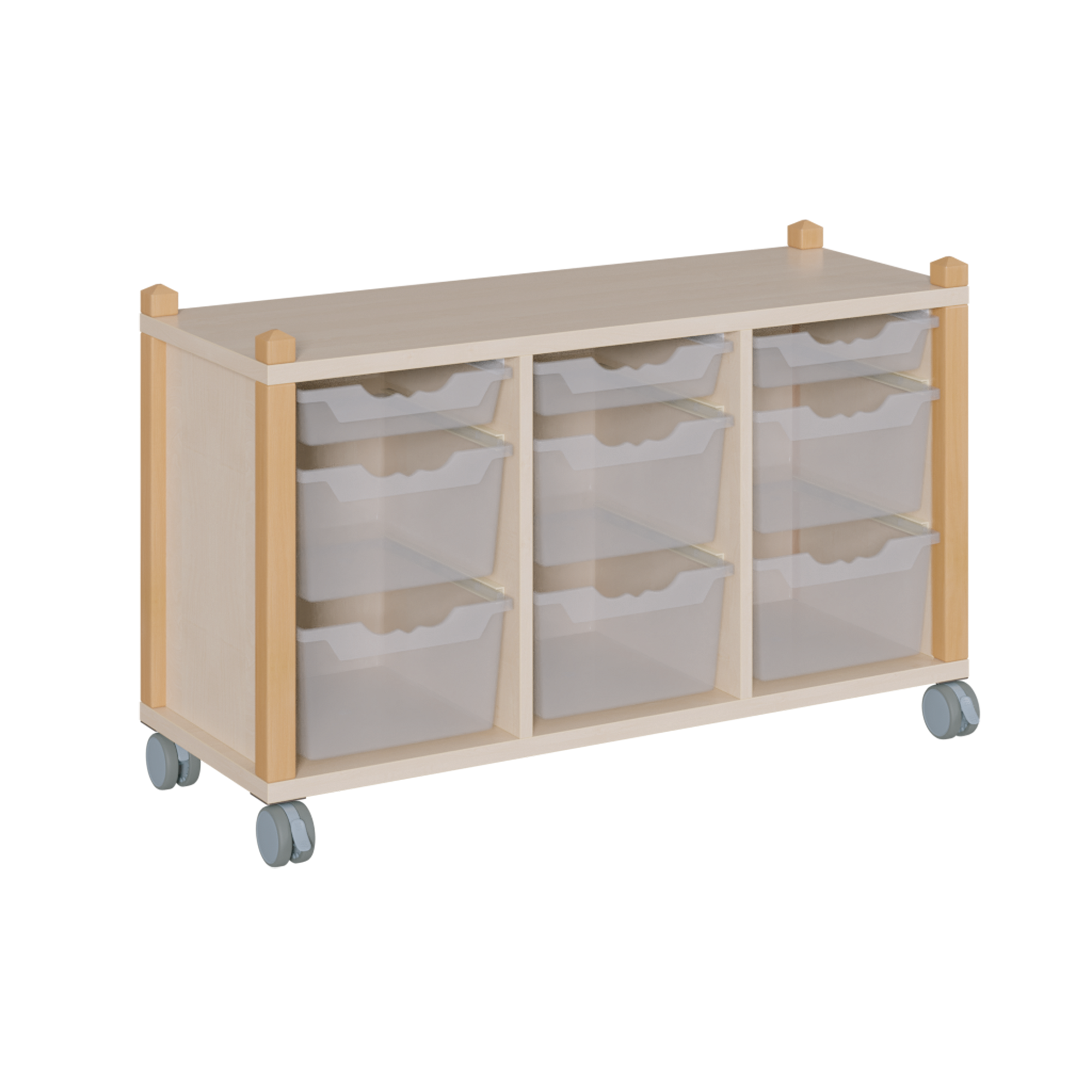 Fahrbare Regale in verschiedenen Höhen bieten die Möglichkeiten für die unterschiedlichsten Einsatzzwecke. Die Trennwände bilden eine Dreiteilung für die unterschiedliche Größe und Anzahl der ErgoTray-Boxen. Die Rückwand ist als Sichtrückwand ausgeführt, dementsprechend ist die Eignung der Regale als Raumteiler gegeben.