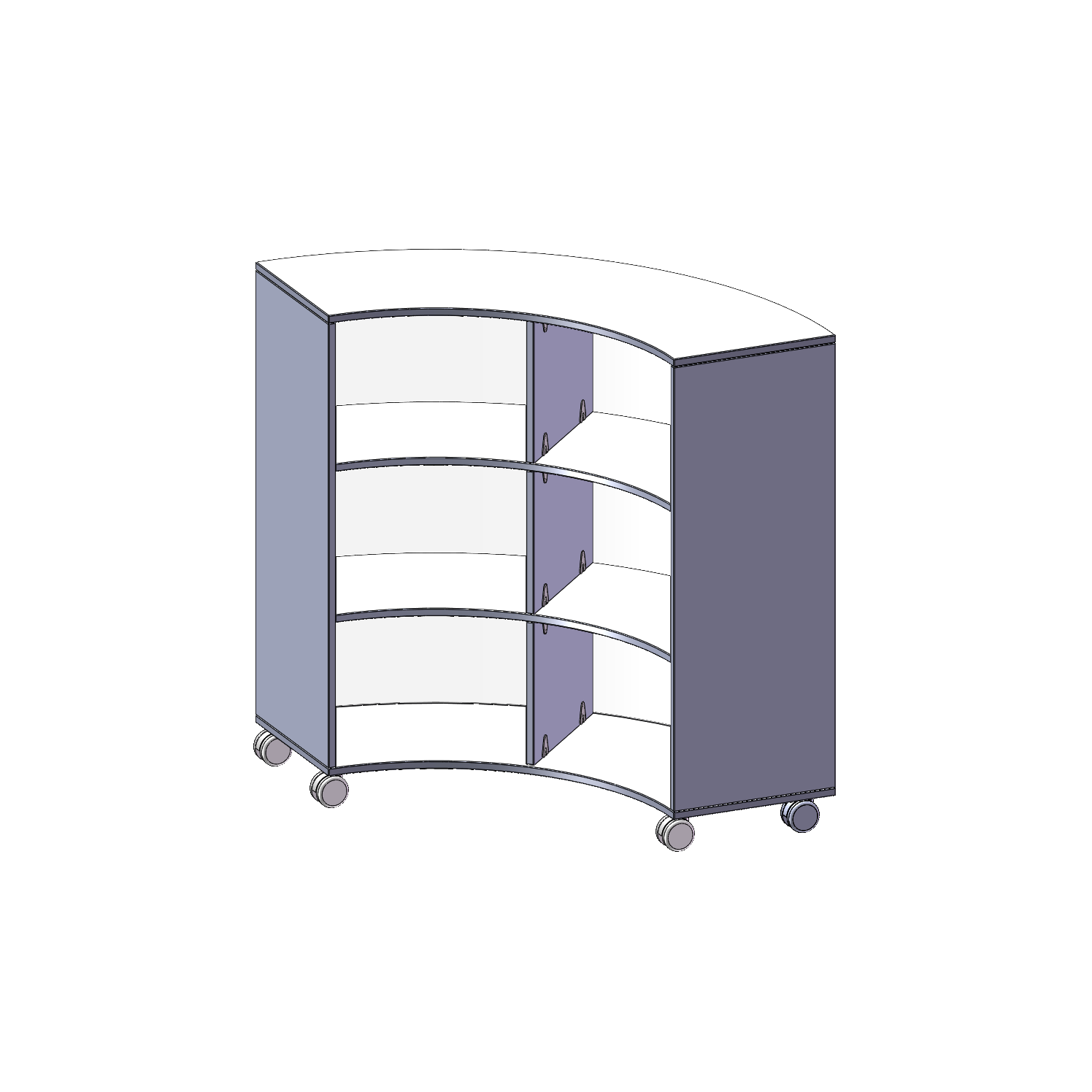 Die fahrbaren Viertel- & Sechstelkreisregale haben den Bogen raus! Mit ihrer Hilfe sind ganz besondere Regalkombinationen im Klassenzimmer oder in anderen Räumen möglich. Mit ihren 40 cm breiten Seiten lassen sie sich mit 40 cm tiefen Schränken und Regalen kombinieren. Die Rollen haben die selbe Höhe wie der Sockel aller anderen evo180 Schränke und Regale. Lassen Sie Ihrer Fantasie freien Lauf. Durch den Einsatz der 5. Rolle unter dem Bogenregal ist das Kipprisiko minimiert und ein sicheres Verfahren möglich.