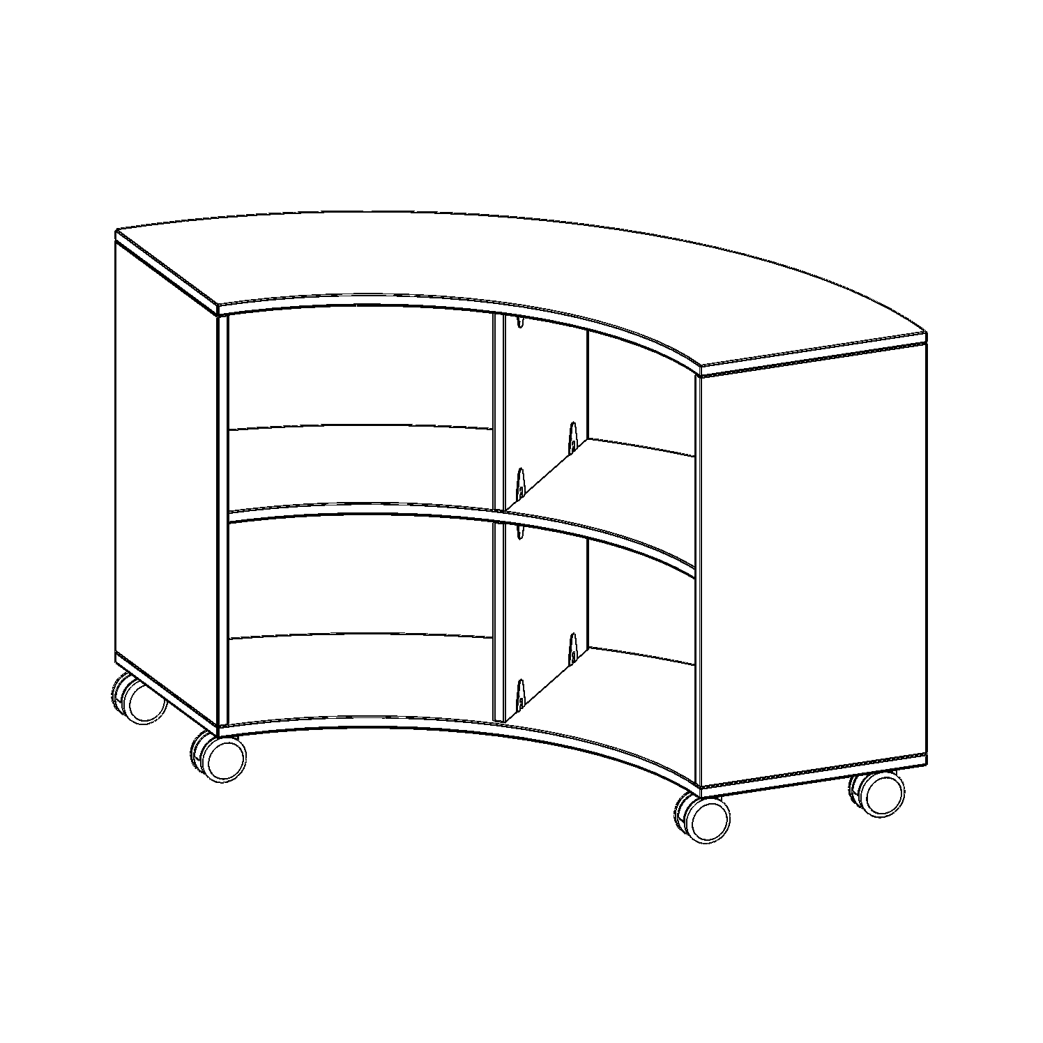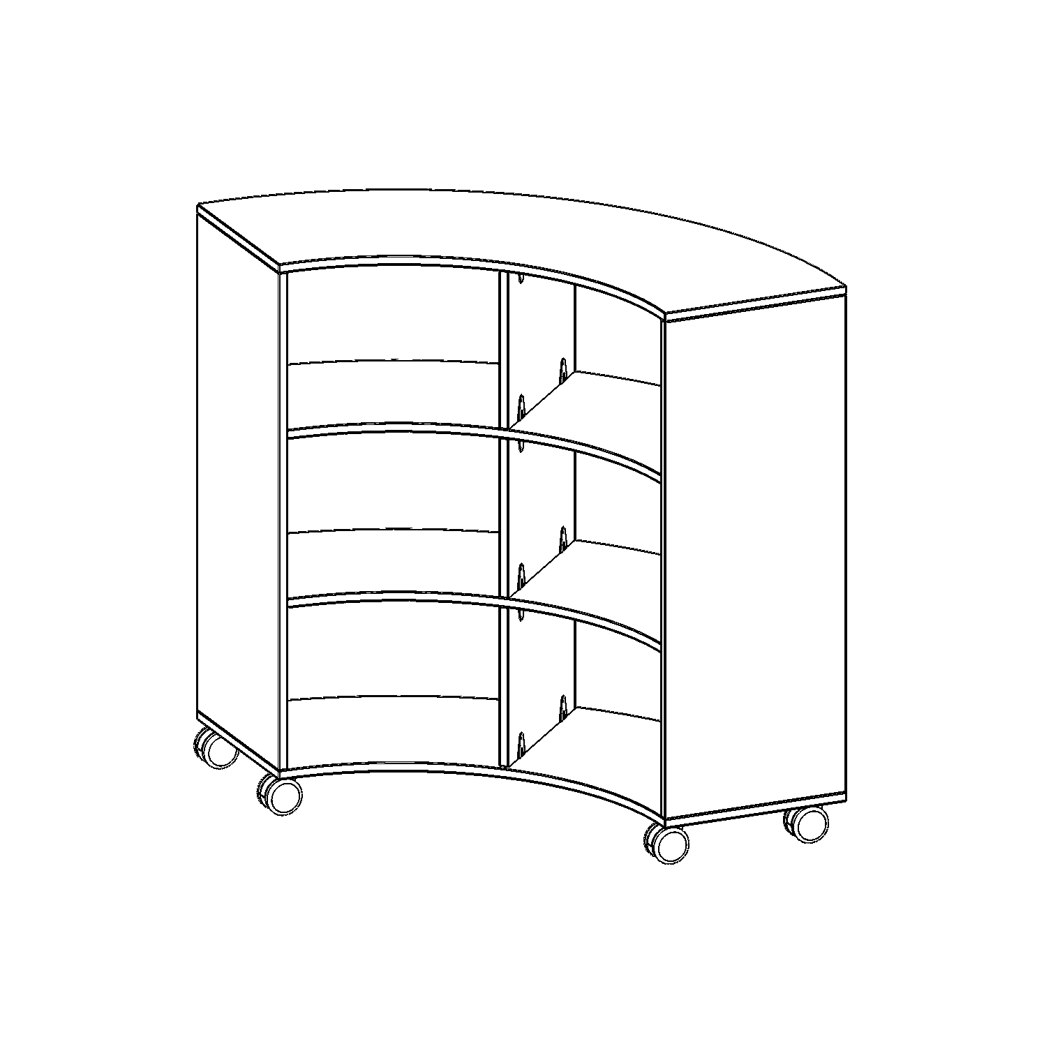 Die fahrbaren Viertel- & Sechstelkreisregale haben den Bogen raus! Mit ihrer Hilfe sind ganz besondere Regalkombinationen im Klassenzimmer oder in anderen Räumen möglich. Mit ihren 40 cm breiten Seiten lassen sie sich mit 40 cm tiefen Schränken und Regalen kombinieren. Die Rollen haben die selbe Höhe wie der Sockel aller anderen evo180 Schränke und Regale. Lassen Sie Ihrer Fantasie freien Lauf. Durch den Einsatz der 5. Rolle unter dem Bogenregal ist das Kipprisiko minimiert und ein sicheres Verfahren möglich.