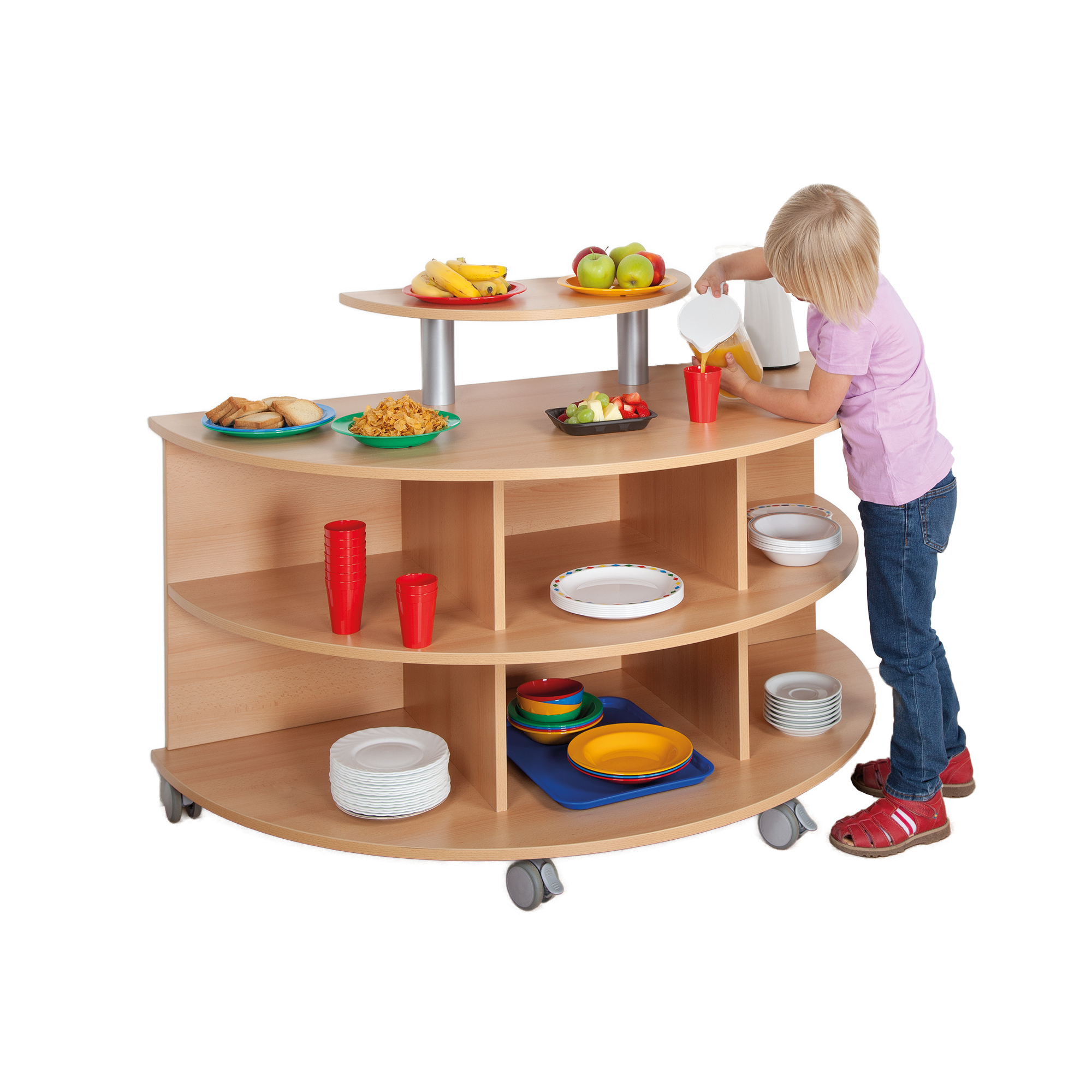 Den Wagen zwischendurch noch mal schnell in einen anderen Gruppenraum fahren? - Kein Problem!: die 6 stabilen Doppelrollen, davon 2 Stück mit Feststellern, sorgen für einen kippsicheren Weg. Durch die Bauhöhe ist das Möbel auch Kindern zugänglich.