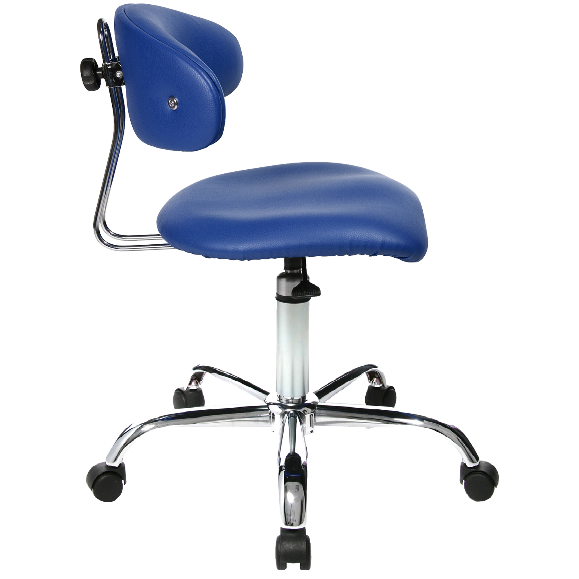 Der Fitness-Orthositz mit integriertem Body-Balance-Tec-Gelenk® sorgt für eine dreidimensionale Beweglichkeit des Sattelsitzes und der Rückenfläche. Darüber hinaus ist die ergonomische Rückenlehne zur Unterstützung einer gesunden Rückenhaltung stufenlos höhen- und tiefenverstellbar. Der Stuhl rollt sicher auf einem formschönen und stabilen 5armigen verchromten Stahl-Fußkreuz, die mit lastabhängig gebremsten Sicherheitsdoppelrollen für Hartböden wie Laminat, Holz, Stein ausgestattet sind. Dadurch rollt der Stuhl nur unter Belastung, in unbelastetem Zustand bremsen die Rollen, um ein ungewolltes Wegrollen zu verhindern. Sie können problemlos durch Teppichbodenrollen getauscht oder ausgewechselt werden (unsere Artikel-Nr. WBR-ROLLEN).