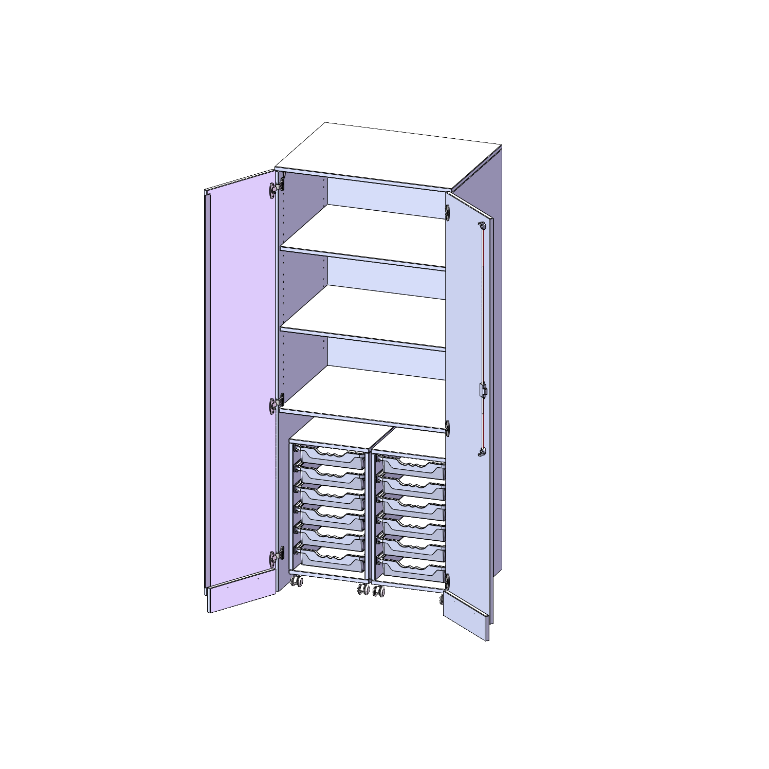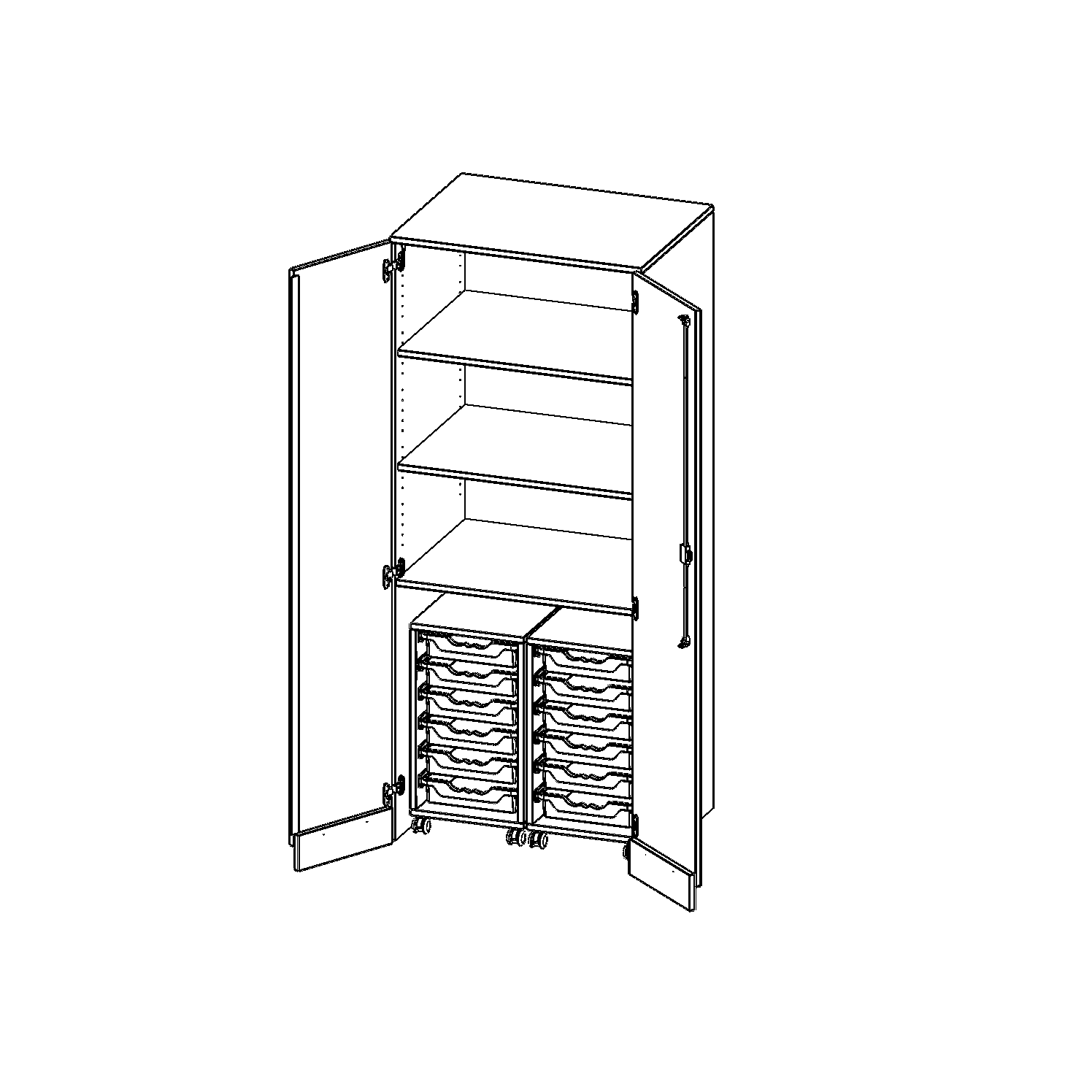 Unsere Garagenschränke bieten wir in verschiedenen Breiten und Ausstattungsvarianten an. Diese Schränke besitzen Türen mit Sockelblenden, damit die Optik der evo-Möbel durchgehend gewahrt wird und sich die eingeschobenen Wagen und Container trotzdem aus dem Schrank fahren lassen. Innen stehen praktische Rollcontainer oder Trockenwagen, die Sie bei Bedarf einfach aus dem Schrank herausrollen und dort verwenden können, wo Sie diese gerade benötigen. Nach dem Unterricht einfach wieder in den Schrank schieben und im Nu ist alles aufgeräumt. Um die Stabilität dieser Schrankkonstruktion zu garantieren, ist im Garagenbereich ein 3seitiger Stahlrahmen verbaut. Die Bauweise bedingt die zerlegte Anlieferung des Schrankes, die Korpusmontage muss vor Ort erfolgen.