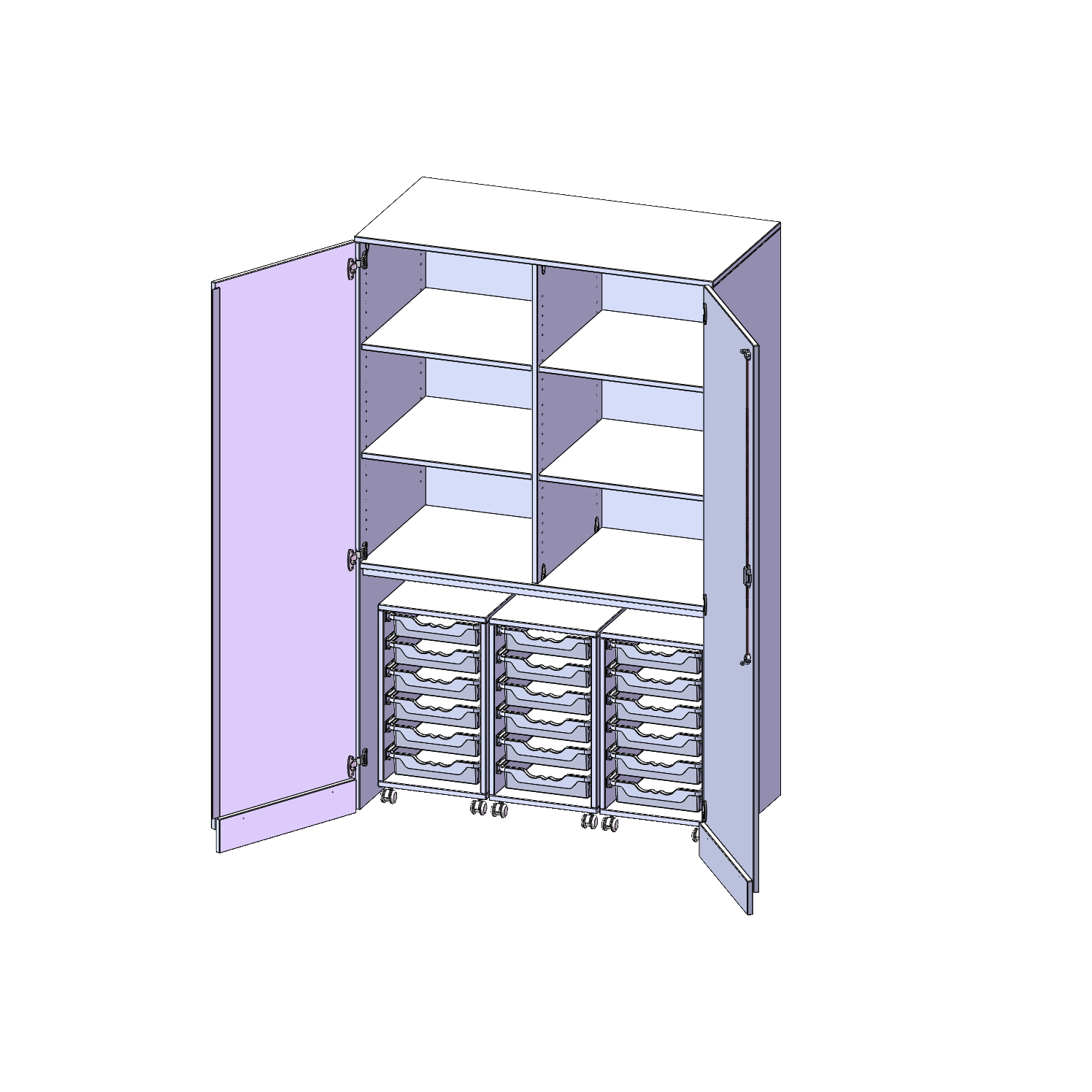 Unsere Garagenschränke bieten wir in verschiedenen Breiten und Ausstattungsvarianten an. Diese Schränke besitzen Türen mit Sockelblenden, damit die Optik der evo-Möbel durchgehend gewahrt wird und sich die eingeschobenen Wagen und Container trotzdem aus dem Schrank fahren lassen. Innen stehen praktische Rollcontainer oder Trockenwagen, die Sie bei Bedarf einfach aus dem Schrank herausrollen und dort verwenden können, wo Sie diese gerade benötigen. Nach dem Unterricht einfach wieder in den Schrank schieben und im Nu ist alles aufgeräumt. Um die Stabilität dieser Schrankkonstruktion zu garantieren, ist im Garagenbereich ein 3seitiger Stahlrahmen verbaut. Die Bauweise bedingt die zerlegte Anlieferung des Schrankes, die Korpusmontage muss vor Ort erfolgen.
