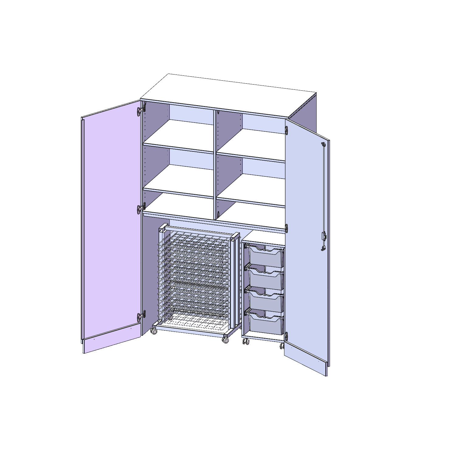 Unsere Garagenschränke bieten wir in verschiedenen Breiten und Ausstattungsvarianten an. Diese Schränke besitzen Türen mit Sockelblenden, damit die Optik der evo-Möbel durchgehend gewahrt wird und sich die eingeschobenen Wagen und Container trotzdem aus dem Schrank fahren lassen. Innen stehen praktische Rollcontainer oder Trockenwagen, die Sie bei Bedarf einfach aus dem Schrank herausrollen und dort verwenden können, wo Sie diese gerade benötigen. Nach dem Unterricht einfach wieder in den Schrank schieben und im Nu ist alles aufgeräumt. Um die Stabilität dieser Schrankkonstruktion zu garantieren, ist im Garagenbereich ein 3seitiger Stahlrahmen verbaut. Die Bauweise bedingt die zerlegte Anlieferung des Schrankes, die Korpusmontage muss vor Ort erfolgen.