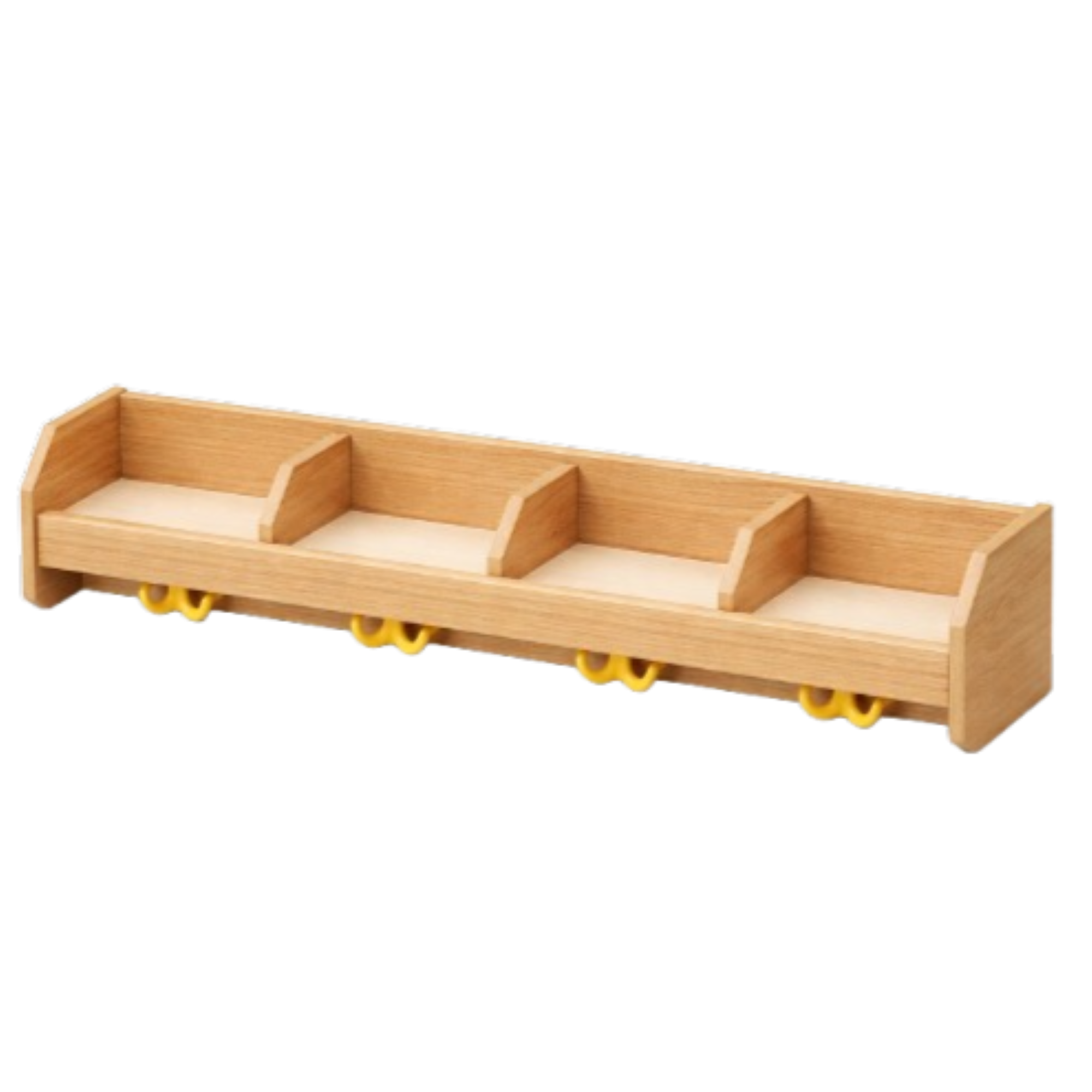 Unsere Garderobenablagen sind infolge des modularen Aufbaus einfach kombinierbar. Die Montage kann direkt an der Wand oder an zusätzlichen Garderobenstützen, z.B. aus dem Bestand erfolgen. Die Fertigung erfolgt aus melaminbeschichteter Spanplatte und Multiplex-Elementen und garantiert Langlebigkeit des Möbels. Oben befinden sich Ablagenfächer, die durch Trenner abgeteilt sind, darunter sind in Anzahl der Plätze farbige drehbare Dreifachhaken montiert. Die Breite und damit die Anzahl der Sitzplätze sind wählbar. Das Korpusdekor und die Hakenfarbe sind wählbar. Für die persönliche Zuordnung des Faches steht die Bilderleiste zur Verfügung.