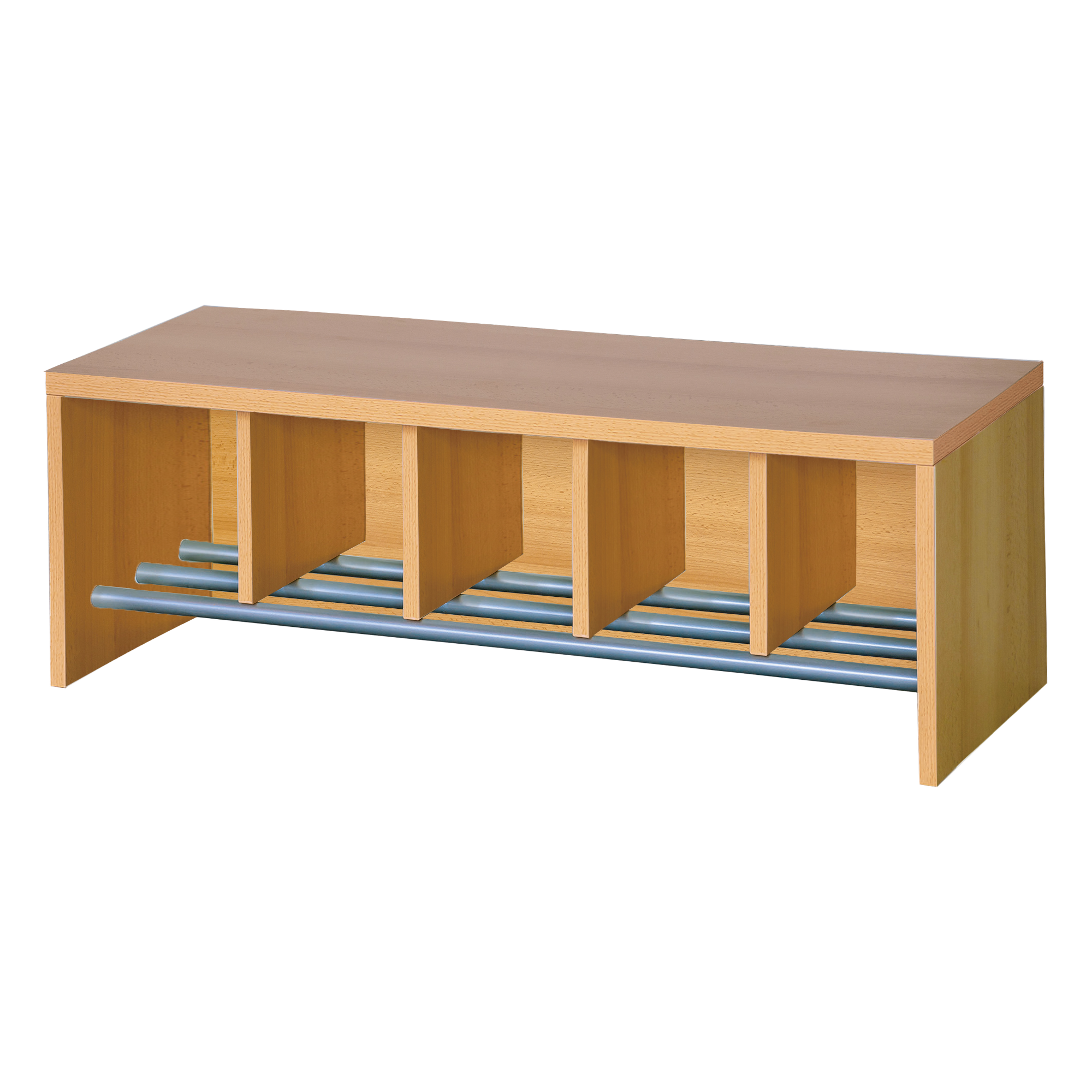 Diese stabile Garderobenbank in Korpusbauweise zeichnet sich durch ein integriertes Schuhrost aus. Hohe Abtrennungen über dem Schuhrost geben die entsprechende Platzanzahl an. Das Schuhwerk wird auf dem mit RAL 9006 - weißaluminium pulverbeschichteten Schuhrost trocken aufbewahrt, Bodenfreiheit 7 cm. Fachmaße ca. B/T: 18x25 cm, Sitztiefe 32 cm.