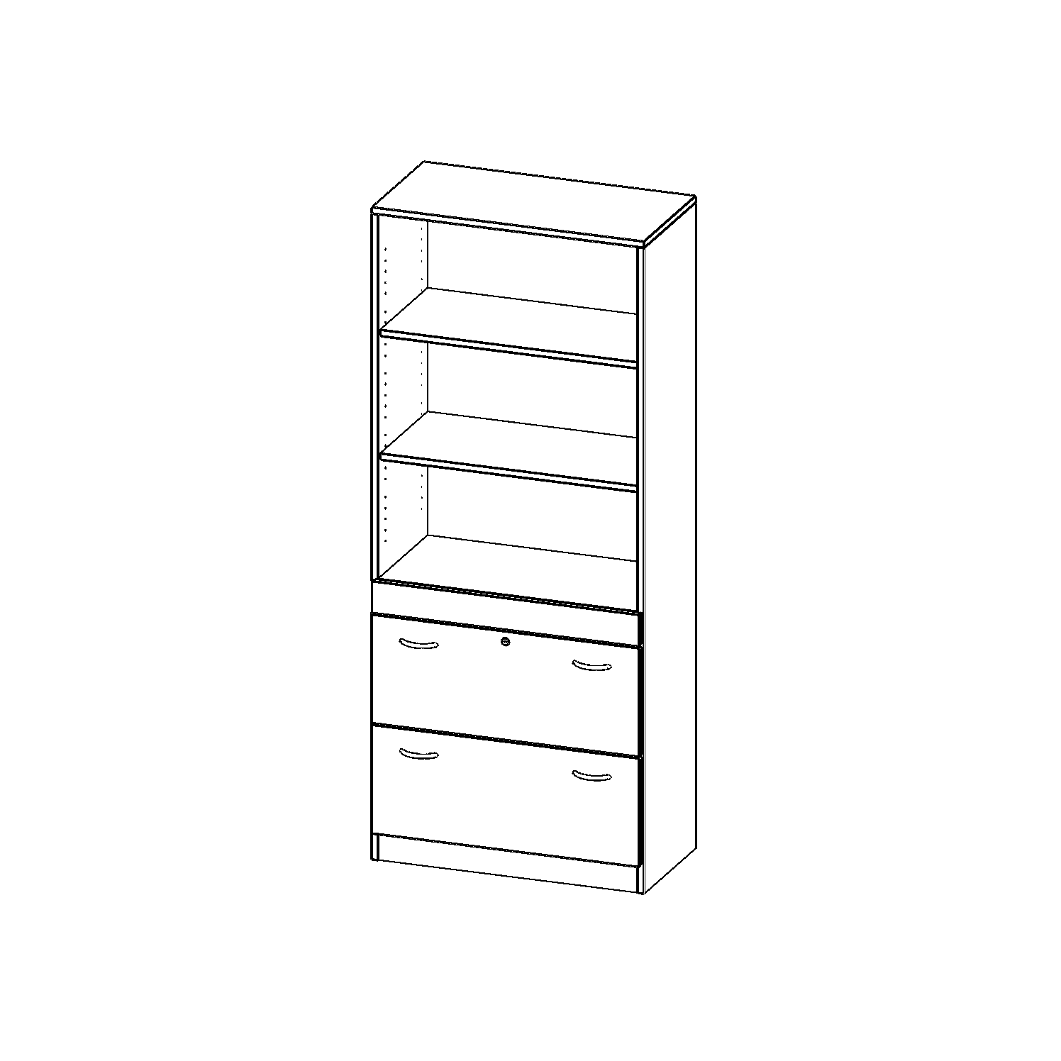 Breite 80 cm, Gesamthöhe 190 cm, 2 Auszüge, abschließbar, oben 3 offene Fächer, mit Sockel (81 mm)