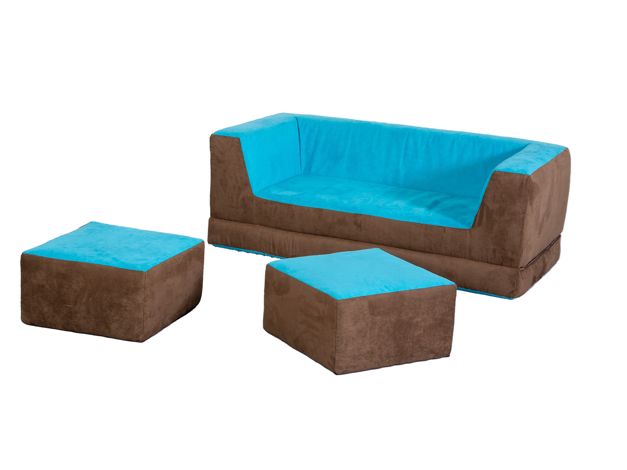 Aufgeklappt ist es eine tolle Ruheinsel, als Sofa bildet es mit den beiden Hockern eine gemütliche Sitzgruppe für Spiele oder zum Lesen.
