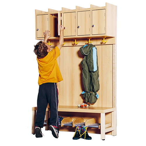 Unsere Komplettgarderoben sind infolge der Fertigung aus lackierten Stützen- und Bankgestellrahmen, 4x4 cm massiven Buche-Holzstollen sehr robust und dauerhaft. Die Garderobenstützen haben wandseitig eine Ausklinkung für Sockelleisten. Zwischen den Garderobenstützen ist flächig eine Paneelrückwand (mit wählbarem Dekor) montiert. Die geräumigen Fachablagen aus melaminbeschichteter Spanplatte sind mit Türen -Griffknöpfe in chrom matt und rechts angeschlagene Türen- verschlossen, darüber stehen 5 cm hohe Ablagen zur Verfügung. Für die Türfronten kann optional eine vom Korpus abweichende Dekorfarbe gewählt werden. Unter der Fachablage sind in Anzahl der Plätze farbige drehbare Dreifachhaken montiert. Die Sitzfläche besteht ebenfalls aus stabiler melaminbeschichteter Spanplatte, das Dekor ist wählbar. Darunter befindet sich ein Schuhrost aus mit RAL 9006 pulverbeschichteten robusten Aluminiumrohren mit zusätzlichen Fachtrennungen.